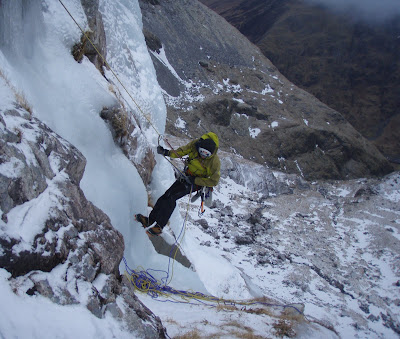 Day 2 of the Introduction to Snow and Ice climbing. We headed to some low level ice and a short walk in (90 mins) - Stob Coire Nam Beith, North Face. On our way in we saw the normal weekend massive crowds. Some heading to No. 6 gully (not complete or in condition), some to Central Gully (not complete), and others to Church Door Buttress. We had our ice to ourselves until PYB and Phil turned up. My 2 climbers enjoyed learning about the joys of ice at grade 3, and later abseiling off ice..