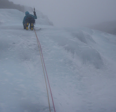 Thank you to Ed Chard and Dave Hanna from Jagged Globe. They gave us a lift up to the top car park (Ed) and later back down again (Dave) - saving us a lot of extra walking from the bottom car park. Today I was out with Hannah Evans from Outward Bound - Loch Eil. We had our eyes on one of the routes on Number Three Gully Buttress, or Creag Coire na Ciste. We decided on Green Gully, a popular classic. After a couple of pitches to get to the first ice pitch things were going swimmingly. I was half way up the pitch, when it started - the heavy spindrift, lasting for about a minute at a time, making it impossible to see my axes in my hands, or my hands! After about 4 of these, I was unable to make upward progress, so climbed down :( . We then abseiled off, to fight another day. A team that started earlier than us did manage to avoid this particular volley of falls, and made it to the top of Green Gully. The ice I did was of great climbing quality. A climbing team of 2 set off for No. 2 Gully - hopefully a good outcome for them. Ed Chard climbed North Gully.