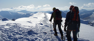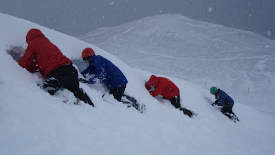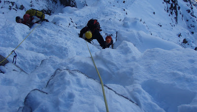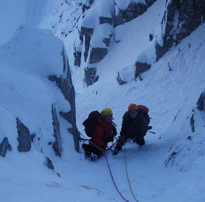 Andy and Steve wanted to learn to lead today, and start to put all the pieces together and get their 'Hands On'. We went to Beinn Udlaidh. The drive down the last few km was a bit worrying with no winter tyres. We got to the car park and found lots of other people with the Beinn Udlaidh idea. Approaching West Gully we found 3 other instructional teams with the same idea, including Mark from Jagged Globe.