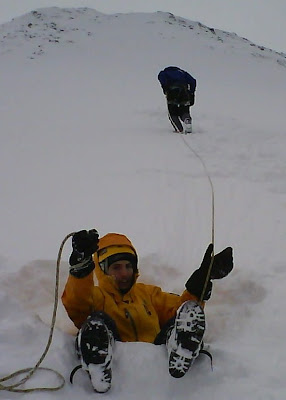 Working with Zac and Chris on day 3 of the mountaineering course. We woke up to thick and heavy snow on a light wind in Fort William. There was about 10cm of fresh snow on the car in the morning, all the roads were white and the snow flakes were as big as tea bags (round tetley ones !). Unbelievable - although maybe it is given the winter we've had so far. We had to think of somewhere to go, that would be possible to drive to, safe - considering the high avalanche hazard, and a venue where we can cover the new mountaineering hard skills. We made our way to Aonach Mor.