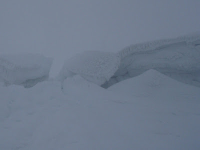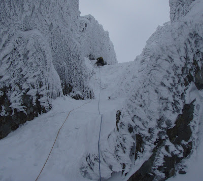 I met Josef and Angus at the Nevis Range. This was to be Josefs' first day in crampons and he was up for a climbing adventure. We headed for the East Face of Aonach Mor and checked out the safe exits through the cornices. We abseiled down Easy Gully, and made our way to Forgotten Twin which has got the icefall start on the left - in condition at the moment. We were the second party in the climb. There was a constant stream of parties on most of the popular climbs. We had a fun exit through the cornice.