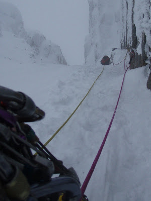 The was also a stream of teams in Right Twin - but there is currently no exit. The first team reached the cornice and fortunately received a rescue from a climbing team above - and so the rescues continued - this ream rescues the next, and then these the next.