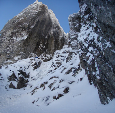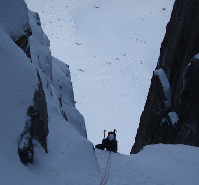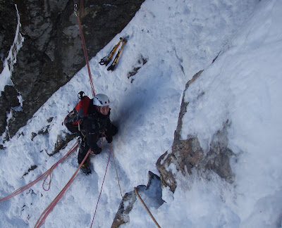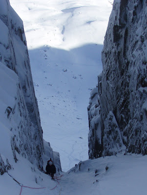 The cornice at the top had a gap well developed, so the exit was easy. A terrific climb and well worth it's 3 stars.