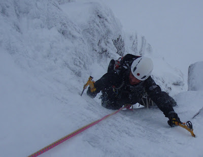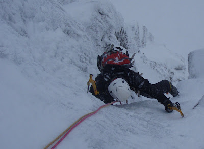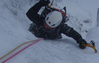I was keen to check out the East face of Aonach Mor. I was with Lena from Outward Bound, Loch Eil. We found PYB out and about on Aonach Mor as well - some were heading for Morwind. We abseiled down into Easy Gully - the Cornice was solid but undercut. We found White Shark and made a start. It's graded IV, 4 and earns every penny, steep and exciting. The first good stretch of climbing ends at a good peg belay on the left. This was followed by the steepest section, the steep ice fall up the corner, up onto easier ground. There is currently no gap in the enormous cornice, so I arranged a couple of abseils and got off. We knew we'd have trouble climbing out of Easy, so we traversed off and made the Gondola. The climb earns all it's 3 stars.