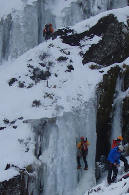My first day with Pulvi and Jack. We headed for Smoking the White Owl for a short walk in and shorter walk out. It was an incredibly busy day on the ice, culminating in 6 leader teams on the final headwall at one point. Too busy, but everybody was careful with the flying ice and nobody got hurt.