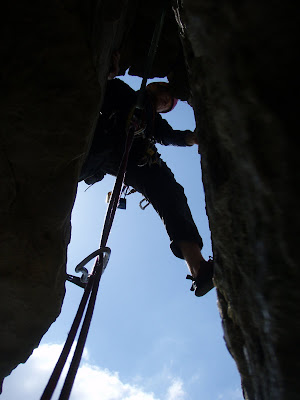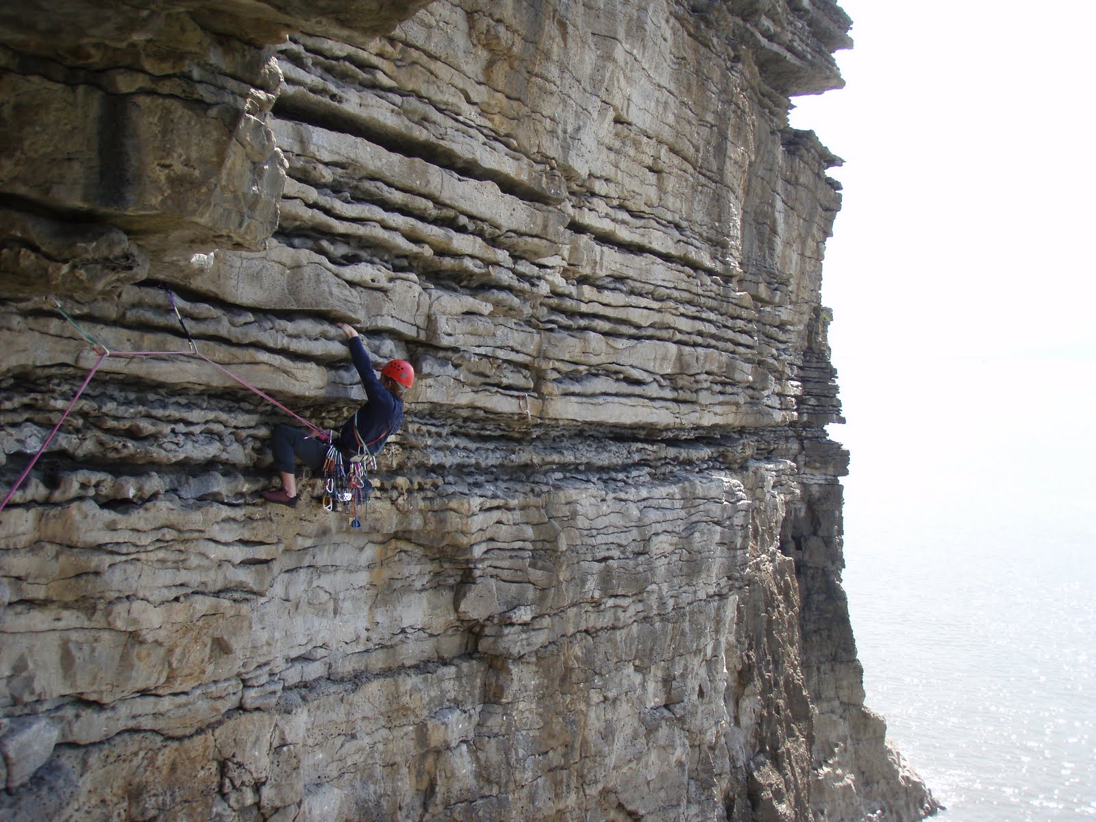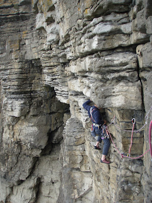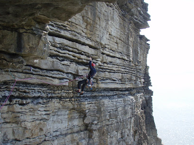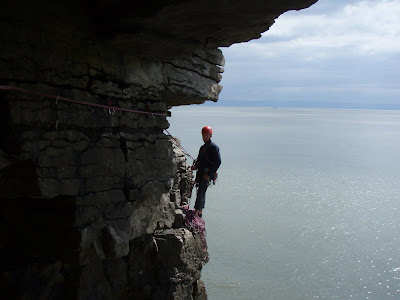 Sunday - a day to enjoy Ogmore... The route had to be Exposure Explosion. 7 pitches. The first leads down! The next 5 are traversing, then pitch 7 up (finally). Awesome route... Go do it..