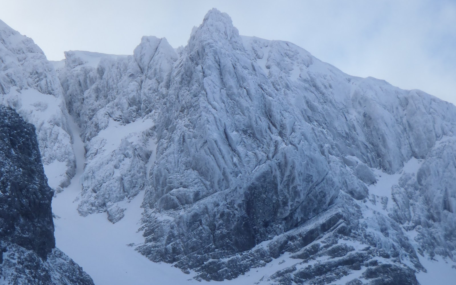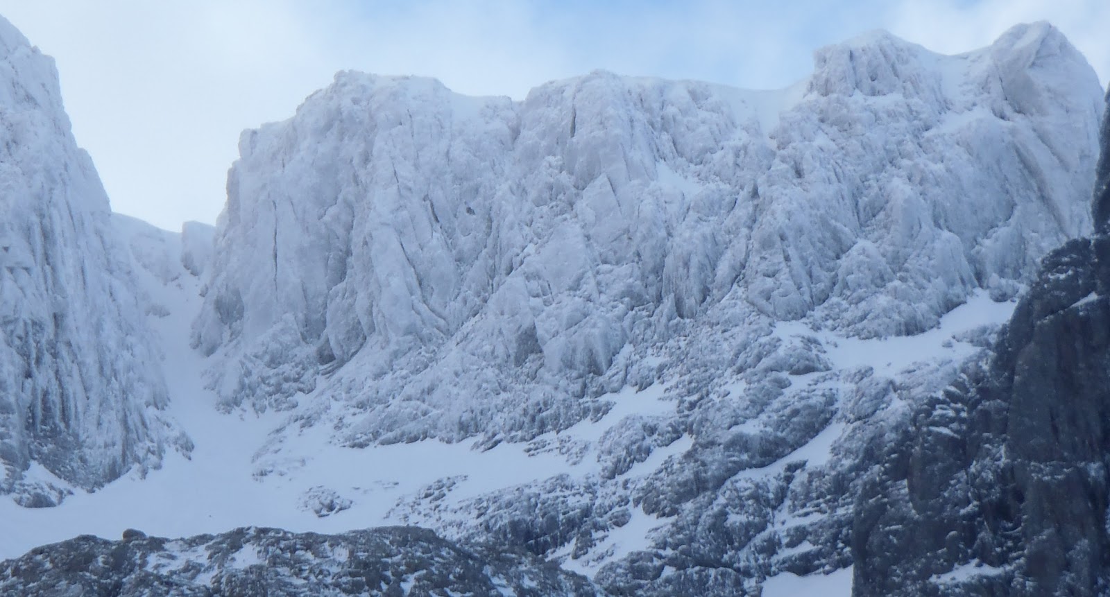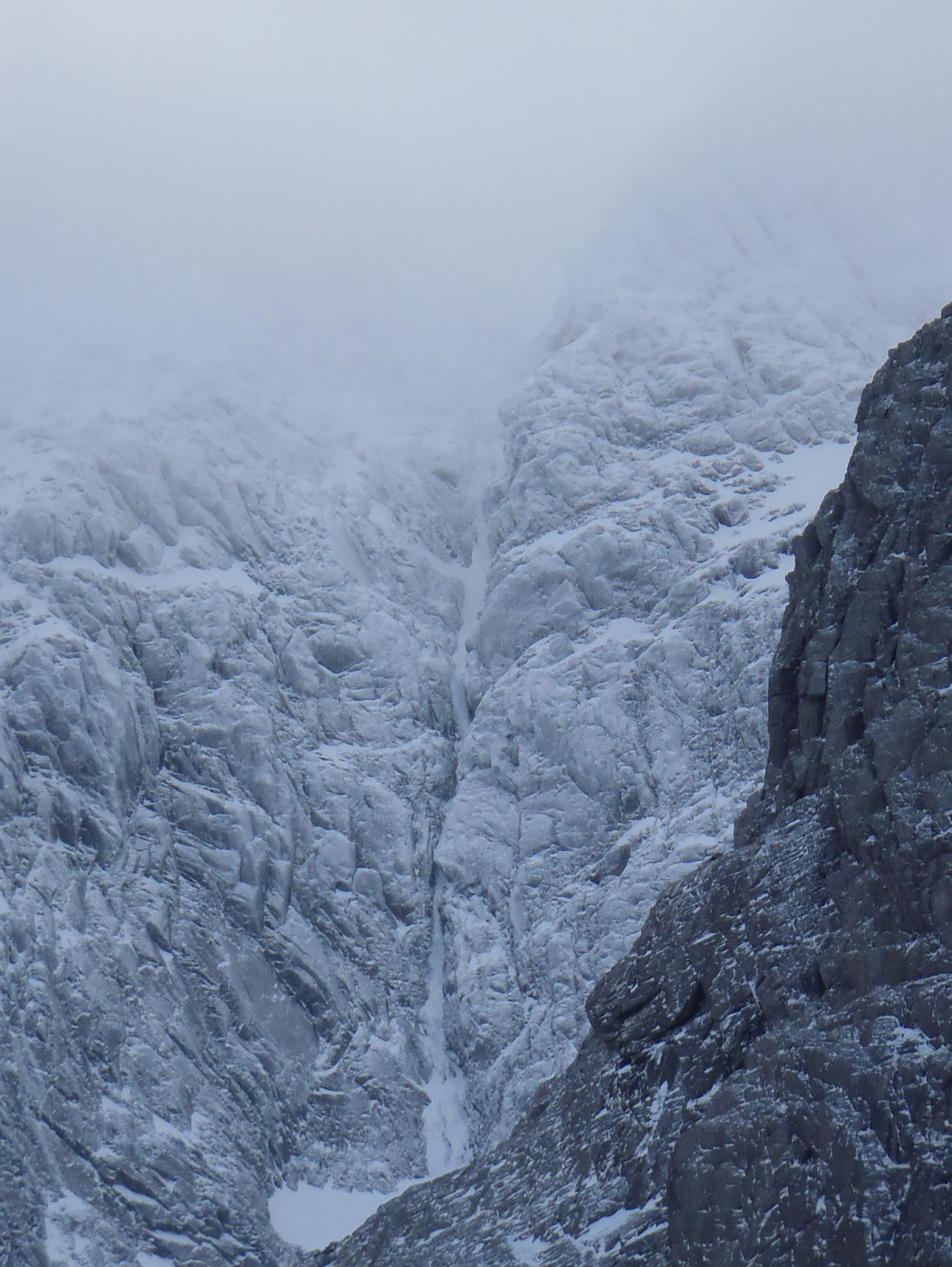 | Looking up at CIC ice falls, Carn Dearg Buttress to Castle Ridge |