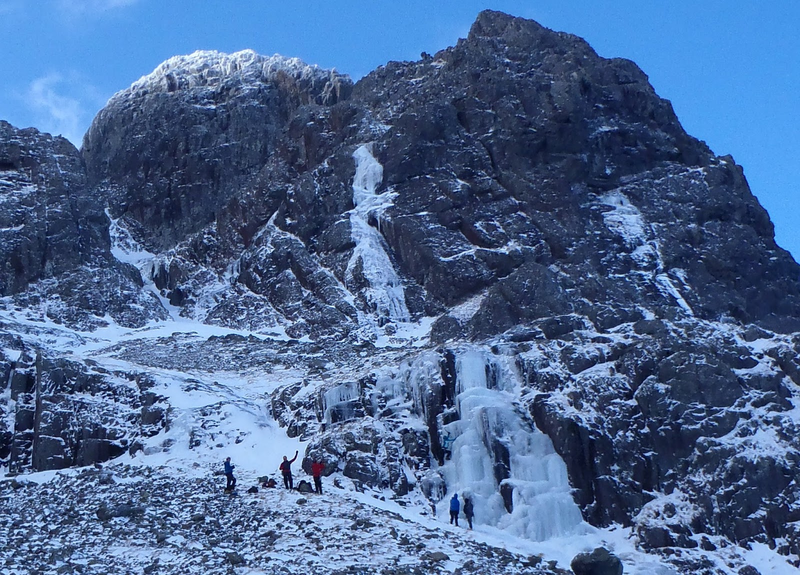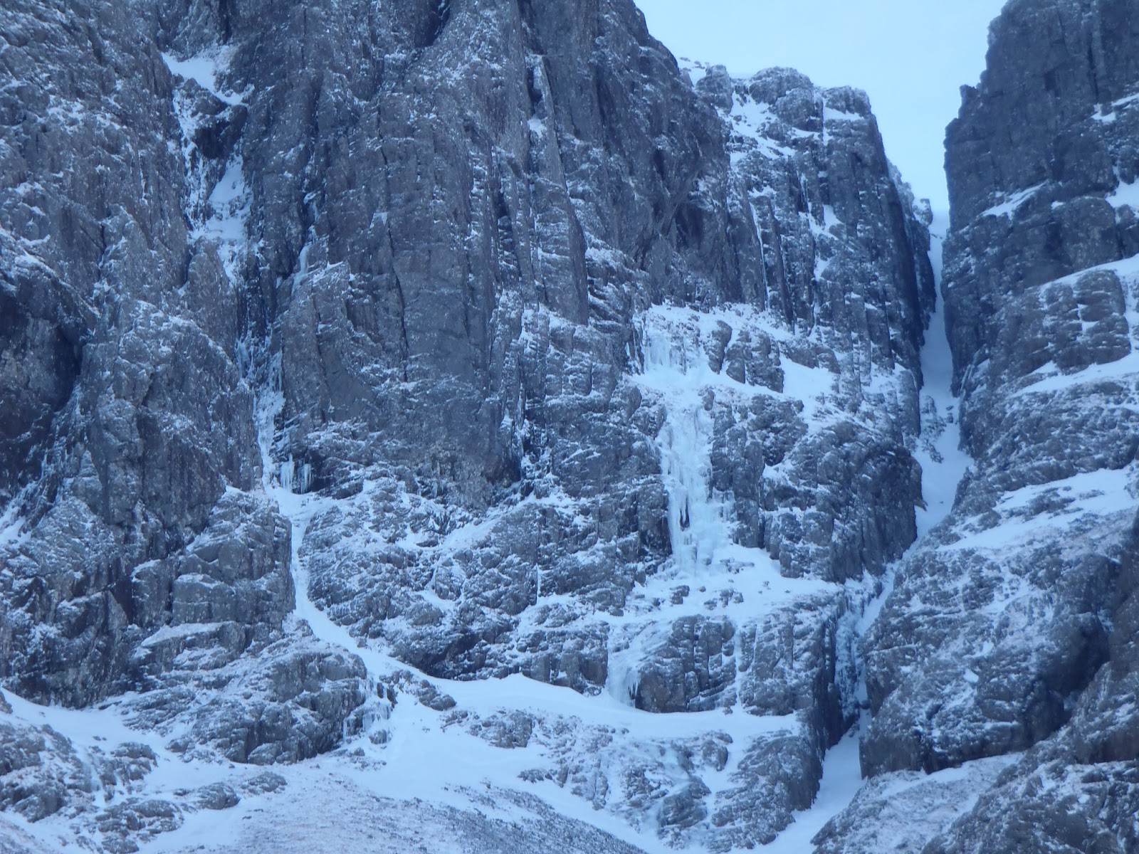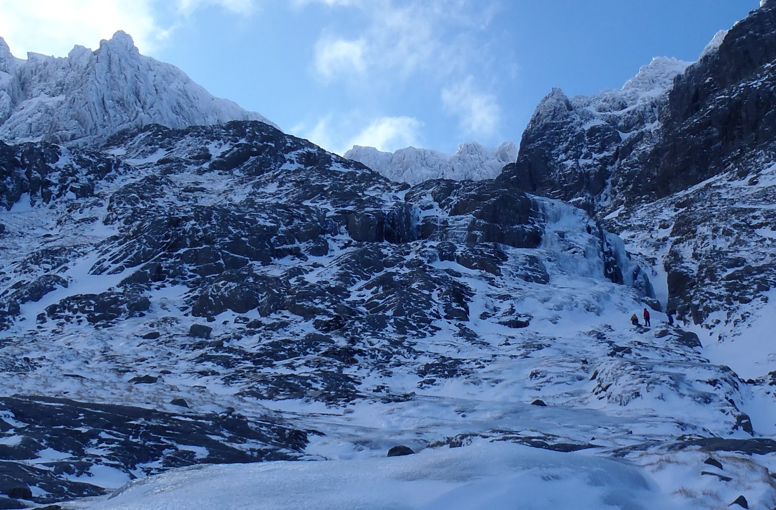 | Looking up at CIC ice falls, Carn Dearg Buttress to Castle Ridge |