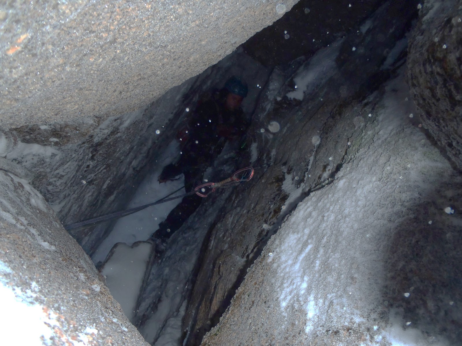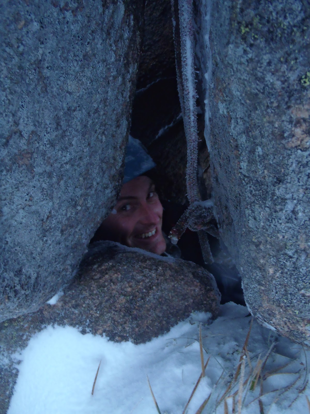 When Matt got to the belay we had to fight over who would lead the last pitch, but he gave it to me, so I nervously/excitedly started up the roof turning pitch. Right at the back, I found the good in-situ thread runner (evidence of people ab-ing off from here). From here I found some bomber hooks, then a nut runner, then a spike, then the final in-situ black thread runner. The final moves were equally exciting, then I was out - into the poor weather - I almost wanted to get back into the shelter of the chimney! I took a belay where I could see Matt, then it was his turn. The videos are quite funny, but if you don't like swearing, please turn the volume to mute on the last video!