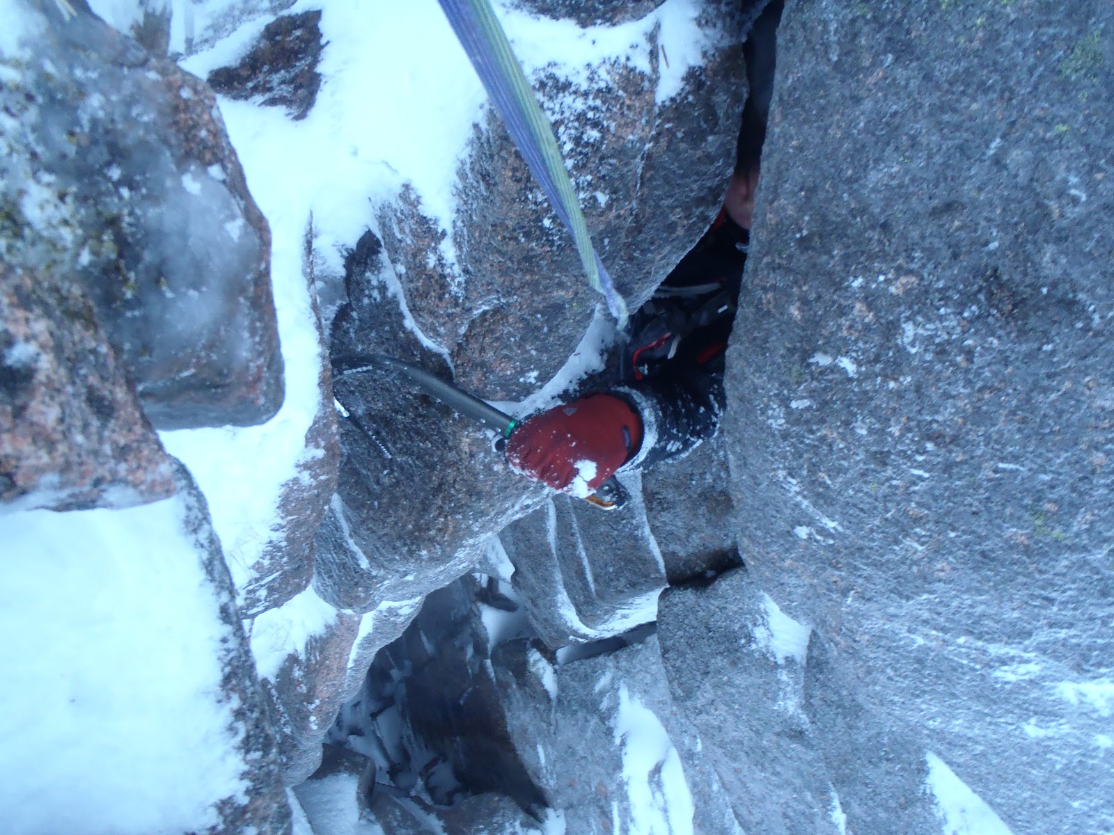 After celebrating Hannah's birthday on New Year's Eve, Matt and I got an early night, so that we could have an early start on New Year's Day and head off to the Cairngorms. We wanted to take a look at Deep Cut Chimney (IV,5 ****), but we knew that we would have to take care of the new easterly aspect windslab. The slab turned out to be very patchy and we were able to navigate a way through, and before we knew it we were at the start of the climb, so it was game on.