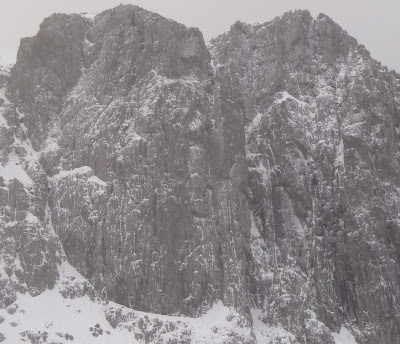 South and Central Buttresses. Can you spot the 4/5 climbers. There is a team (Adam, Guy and John) high on Unicorn, and to the left on Inclination at the top of the Chimney? (Is this Matt and Ben?)