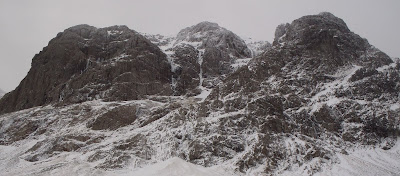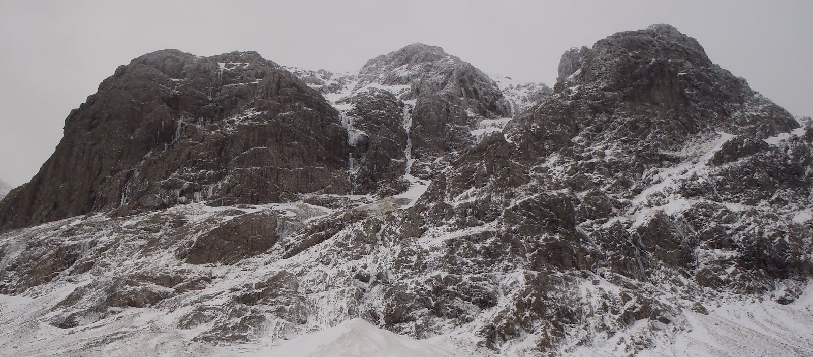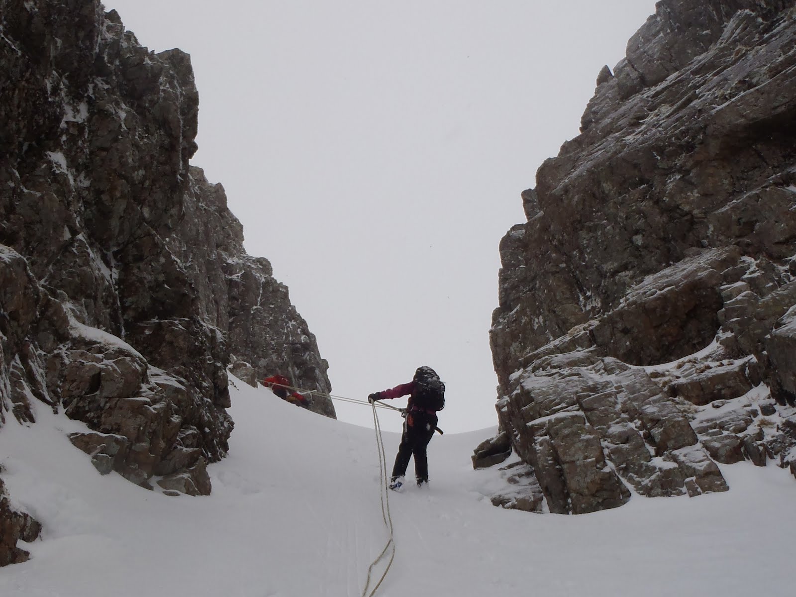 Today was the last day of the Jagged Globe Winter Mountaineering course for Wendy, Dan and Tom. I was working with Tony Halliwell. We decided to head for the Ben. The Ben track was covered in snow causing difficulty for everybody. Only one car made it to the top car park. Again the team wanted to look at winter leading, so they could have their own adventures after the course. We chose the Douglas Gap West Gully and Traverse (I*). Kenny Grant and Ben Wallace both led ropes up Fawlty Towers today.
