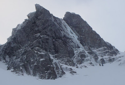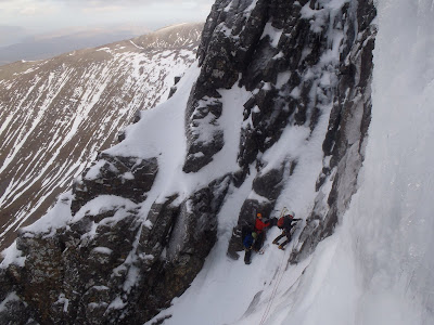 I teamed up with Andy Stotesbury to have a look at the Ben today. After a headtorch start we nearly made it first into Observatory Gully, but were beaten to it by Rocio and Ben. They took a look at Smith's Route but decided it was a little thin with water running behind - so they left it, as did we - off to plan b. However, Kenny, Guy and John went up Smith's on the Icicle variation.