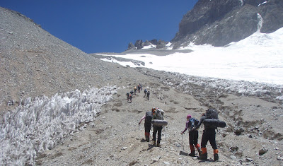Okay so after a quick brush with Santa Claus, we're off and running - well actually sooo slowly! Here we're off on a load carry to camp 1 - and it's XMAS DAY 25th !!! We're all carrying about 20kg from 4200m to 5100m.. 7 hours up, 2 hours down..