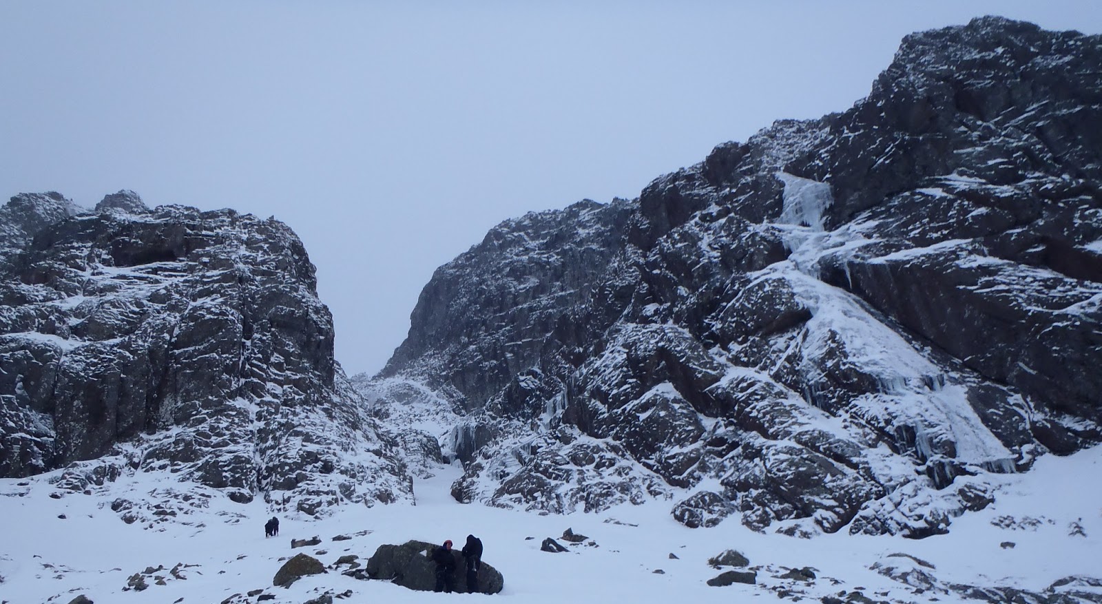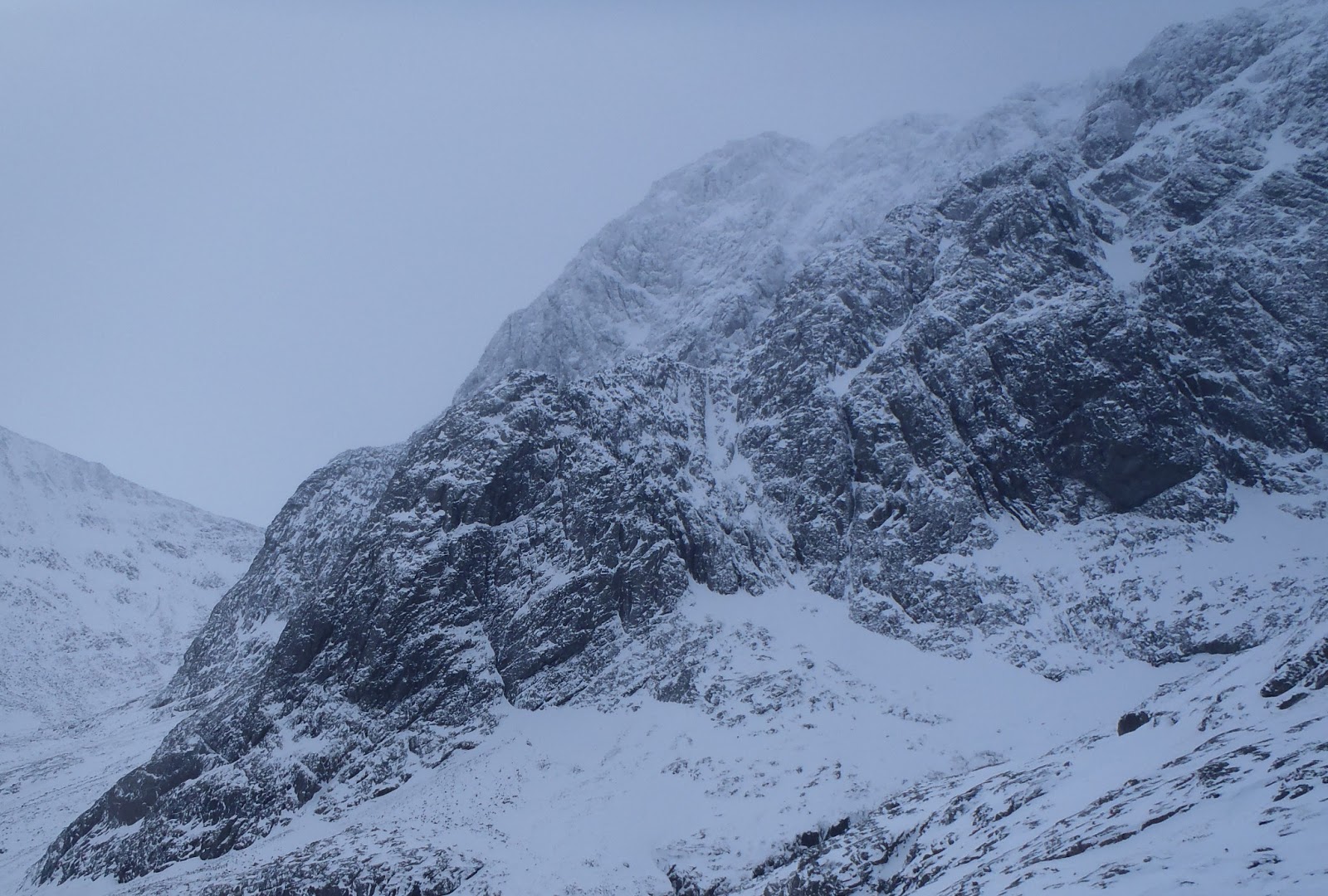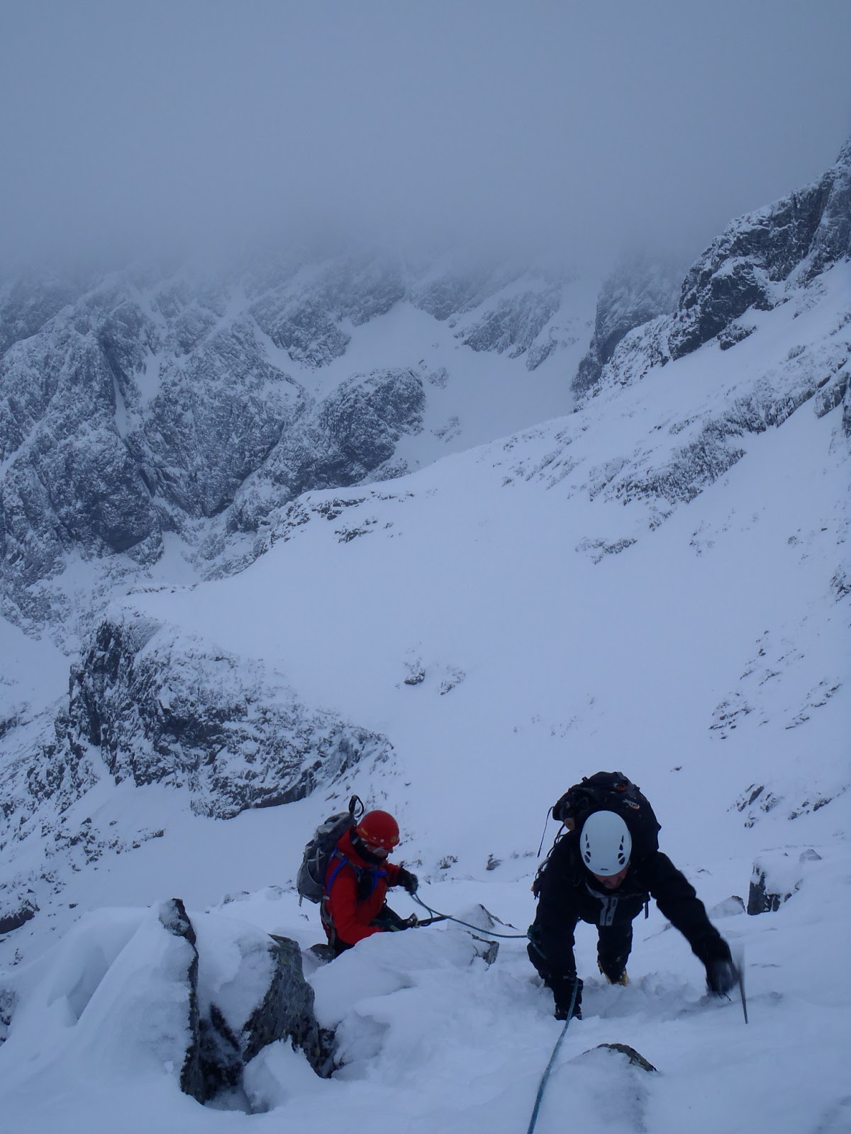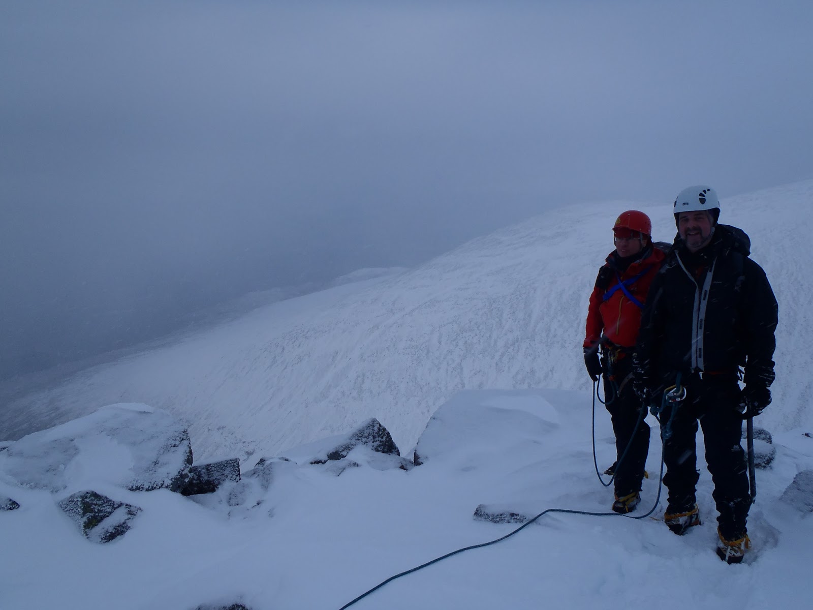 Intro Winter Mountaineering team up number 4 gully. We headed for Ledge Route. It seemed to be the busiest route on the hill today, there were 2 teams ahead of us. I saw a team of 2 on NE Buttress and a team of 3 over towards No 2 Gully Buttress area. The snow into number 5 was slabby in pockets, and avoidable. Also any trail breaking that was needed was kindly done by the 2 teams ahead of me. The first main ledge was relatively easy and secure with good firm snow and neve making the rock slabs easy. I was a bit dissapointed by the clouds - my sunglasses stayed in my bag again, and the cloud even descended over the top of the Ben, and we even had to nav off from the top, where's the sun? The cornices around the rim of number 5 gully looked fresh and a little heavy with the new snow.