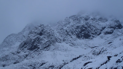 My last day with Dave, we wanted to finish with something on the Ben, either a guided route, or something for Dave to lead, or partly lead himself. We found a great deal more fresh powder snow than I expected. When in Observatory Gully we found that Zero Gully had recently avalanched, and Point Five was showing powder release as well (with a party climbing on it at the time). There were lots of teams heading up onto Tower Ridge, Indicator Wall and Smith's Route areas but, with lots of powder releases on several slope aspects, I didn't think it wise to follow any of these teams. There were several teams heading out of Observatory Gully area for a different plan. We had a quick think, and once we observed avalanche debris high in Coire Na Ciste below Number 3 Gully, we decided to move onto plan E - Ledge Route (II****) - for Dave to lead half of the route. The route was great, and we shared it with several other parties.