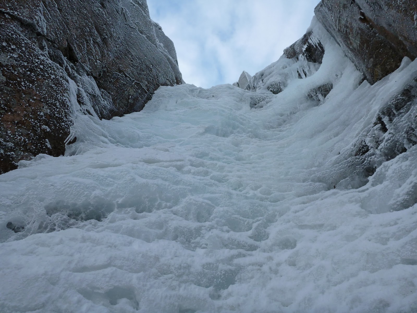 On the crux pitch the ice was good enough for good screw protection, with bomber axe placements all the way, and even some huge ice hooks. It did feel at times like I was back in the Ice Factor, pulling up ice hooks. Fantastic climbing fun.