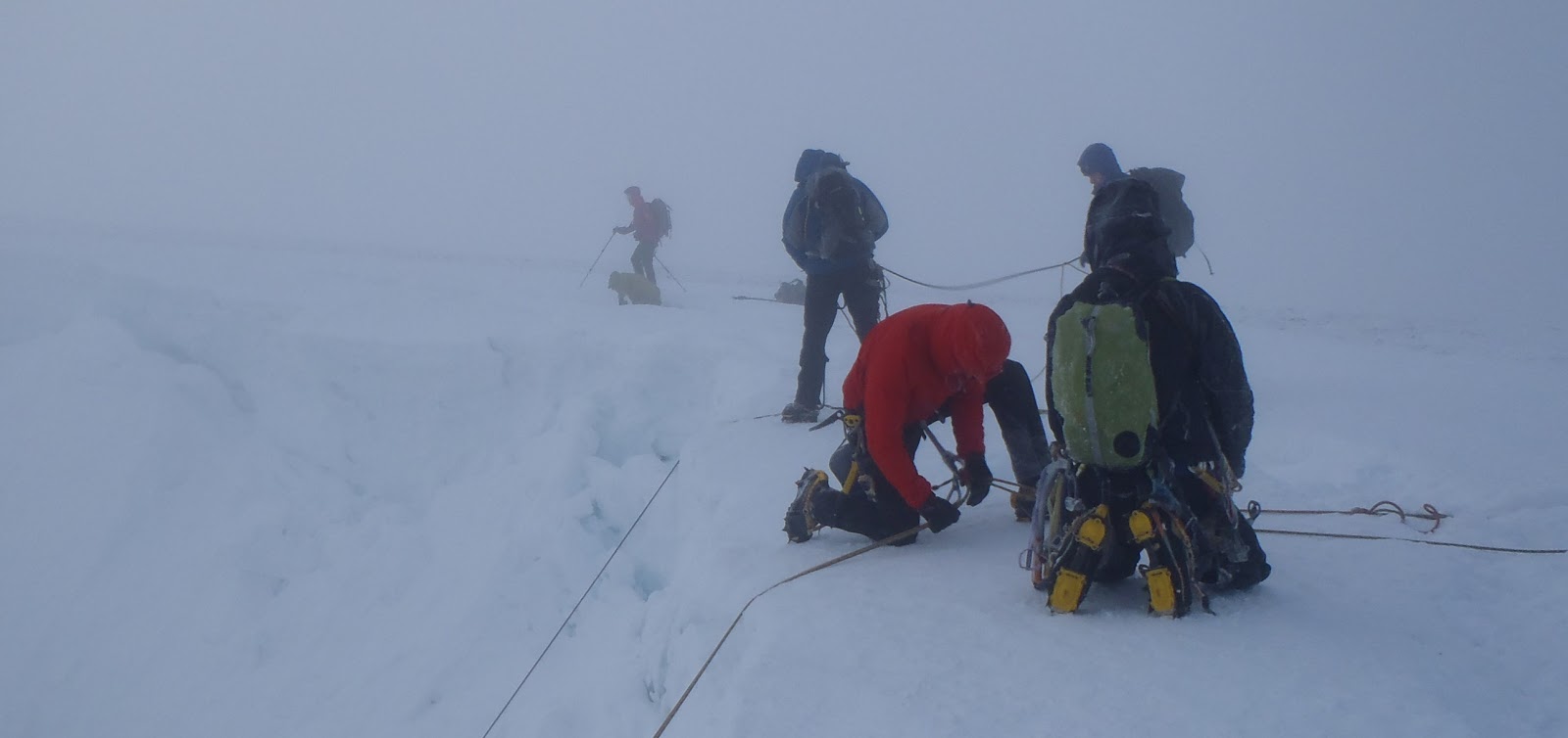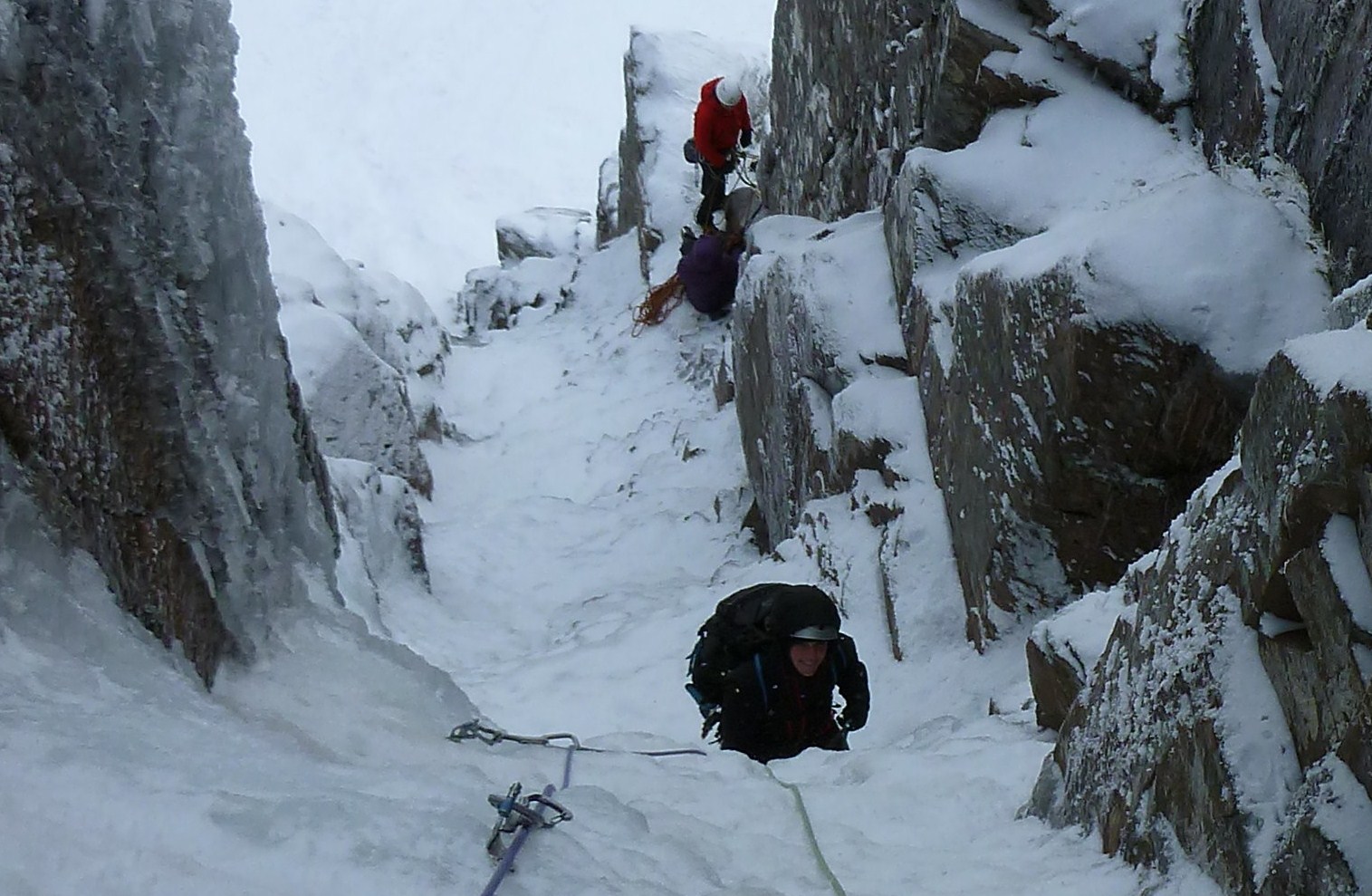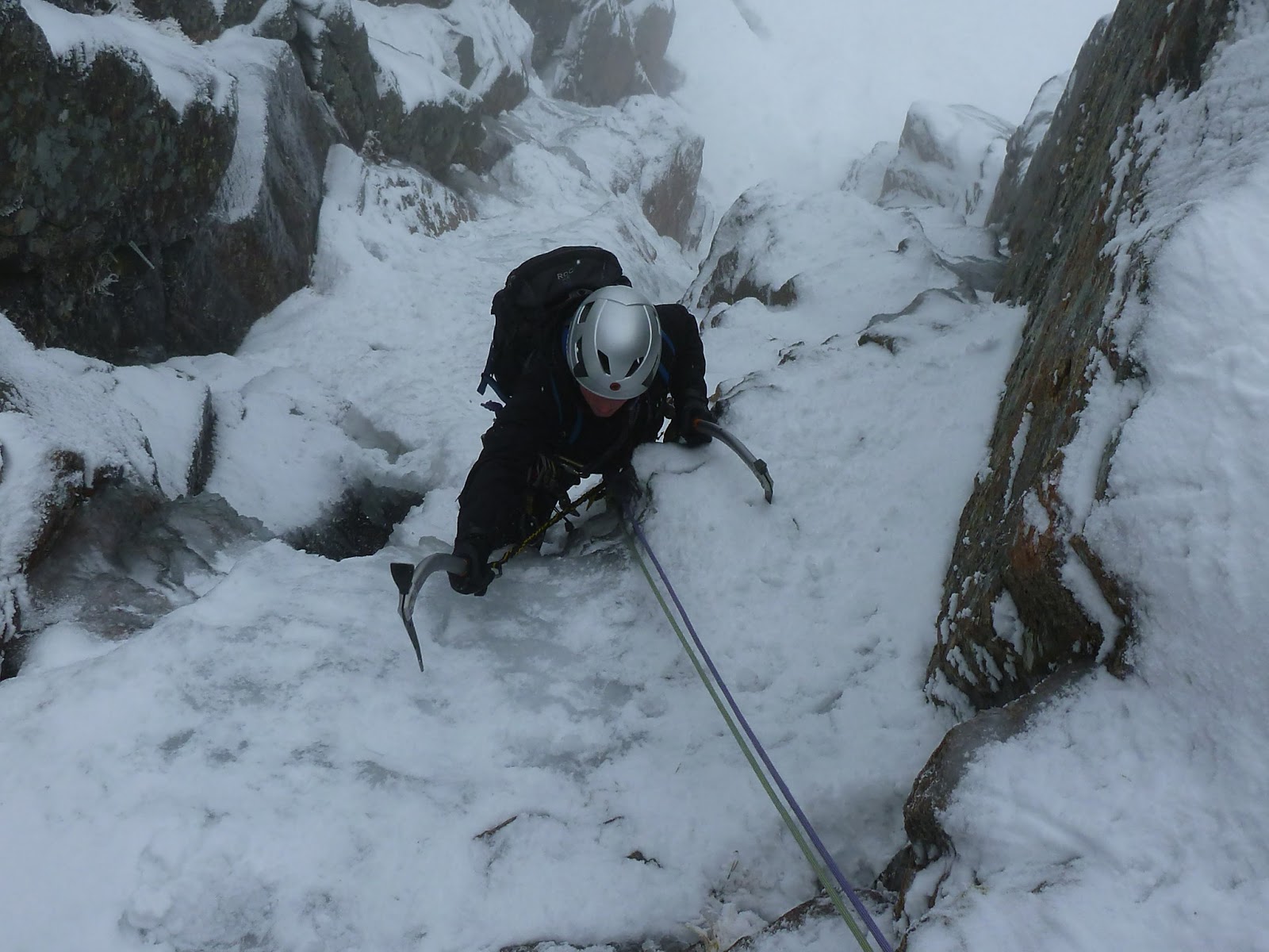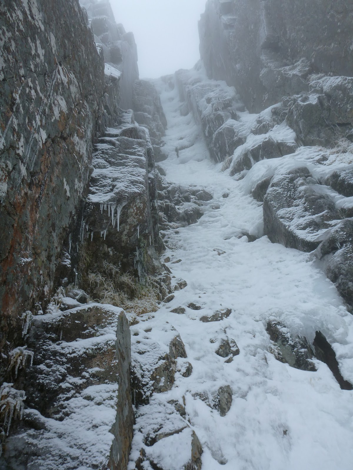| Lena exiting the gully difficulties - enjoying the frozen turf |