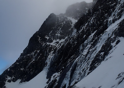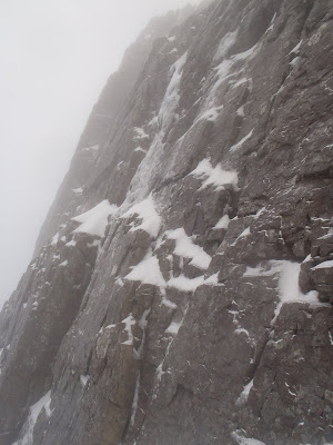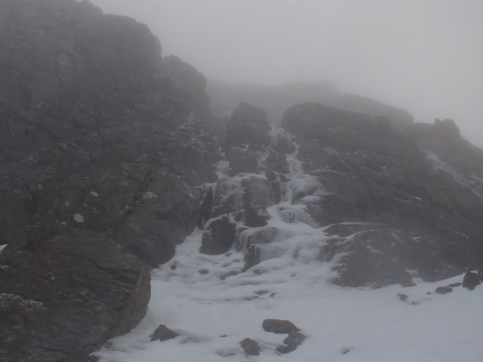 The freezing level was supposed to be at about 800m today, so Foxy (Vicky) and I made a plan to go up the Ben and do something. I had a bunch of ideas for plan a, but as soon as the black buttresses came into view, the plans needed to be re-thought, and most of them thrown away. The freezing level was not 800m as I hoped, but more like summit level! Everything was melting.