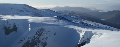 We did choose Pinnacle arete, even though the book says 'the grade assumes some consolidated snow'. What snow there was, was mostly good neve, the turf was frozen and there was some ice which was good. I used 2 screws on the route, and I was very glad of the bulldog. Going right round the corner and then up to the end of the first pitch turned out to be the, hard at the grade, crux. The rocks were all verglassed, and often the feet were on icy smears. The hooks were good enough, and there was even a jug that you could hold and look at the exposure beneath your feet - to the snow apron below the north face.