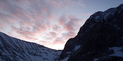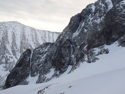 I met up with Andy Stotesbury again for another headtorch start on the Ben. We decided to go and have a look at the Trident Buttresses. There was a slight dusting of new snow on the black crags, and there was verglas on many rocks.