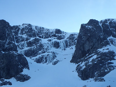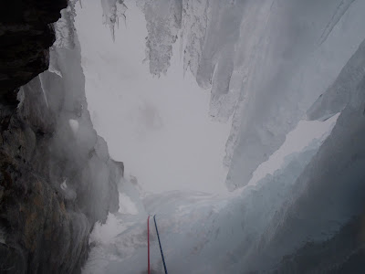 I met Andy Stotesbury for another day on the Ben, and we went off to check out Smith's Route. The mountain was much quieter than the busy weekend. We saw several teams on Tower Ridge, Tower Scoop, Gardyloo Gully, another team on Smith's after us (sorry for the ice on your heads!), Green Gully and White Line. We got to the climb, and the ice looked terrific, and the neve was solid all over the mountain. I was first up, and led up to the cave. There was almost a path of hooks on the way up. The ice was solid and thick - taking long screws. When I got to the cave - it was dry with no dripping - a day for the softshell!