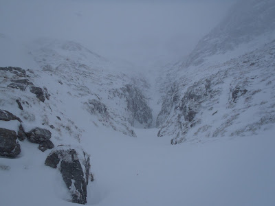 | Looking up from where the path crosses the stream towards the waterfall. The fall is frozen and the stream has deep drifts covering it. |