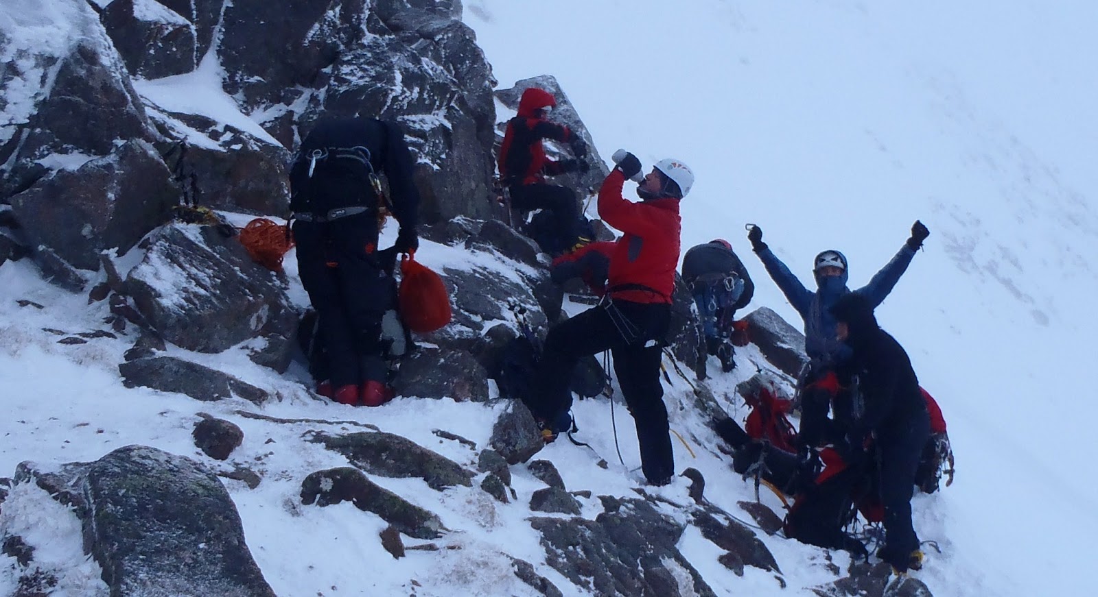 We made our way to the flat ice (which was in excellent frozen exposed condition) for some crampon training. After a bit of coaching and new confidence the team started the journey up the neve towards the Fiacaill Ridge notch.