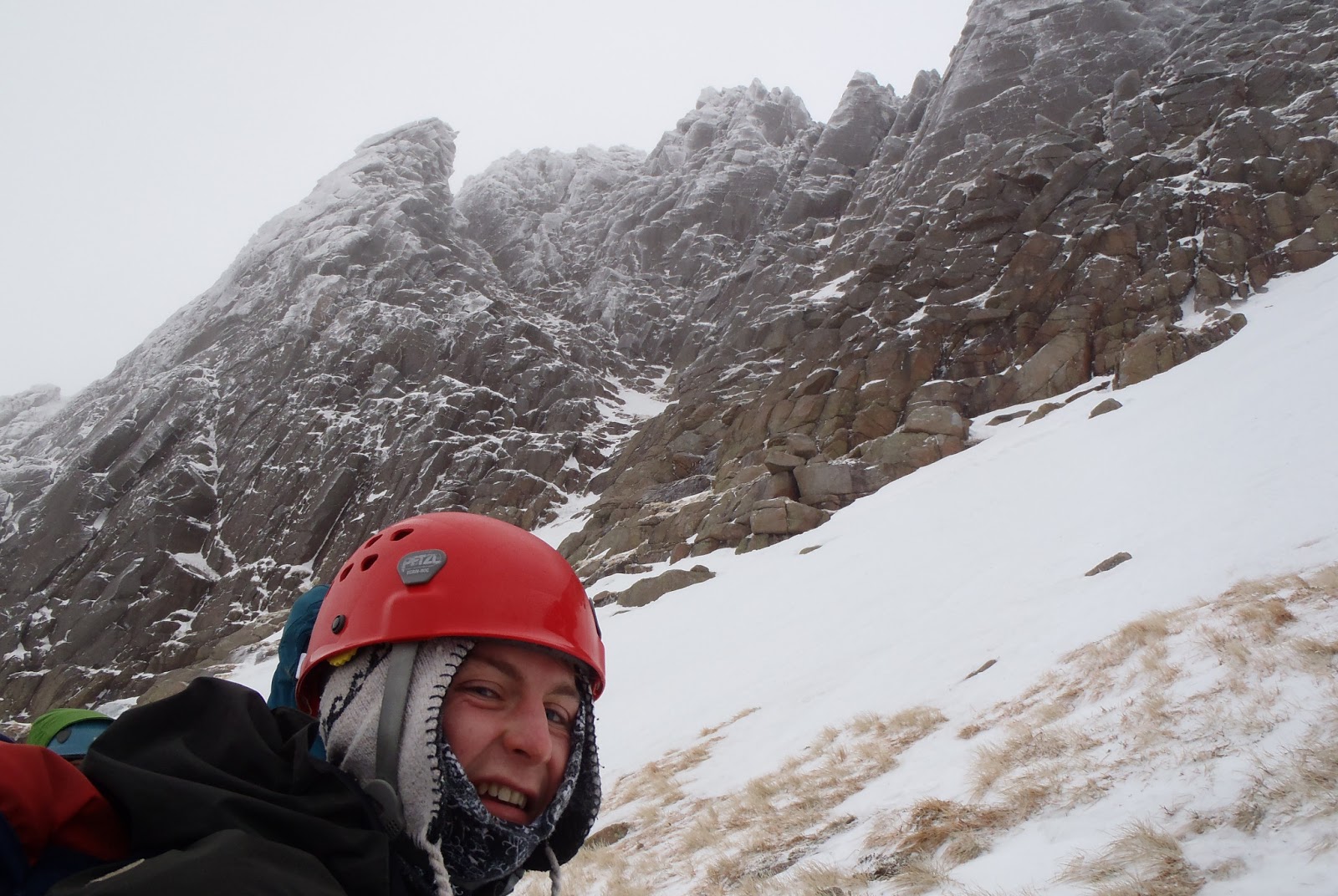 Glenmore Lodge. We headed into Coire an t-Sneachda in very blowy conditions - and about the coldest windchill I've had this winter. We met about 5 climbing teams heading out of the Coire. One team retreated from the snow slopes below the Mess of Pottage - wise! We saw another team trying to climb on Aladdin's Buttress, but eventually retreated. We heard climbing calls from somewhere on Aladdin's Buttress too, perhaps Aladdin's Mirror Direct - we saw climbers at that belay.