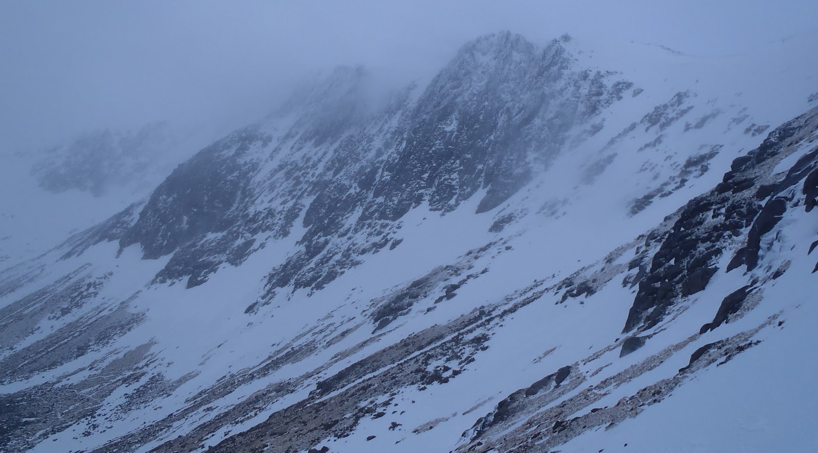| Aladdin's Buttress, Fluted Buttress and the Goat Track - the snow slopes all loaded with slab |