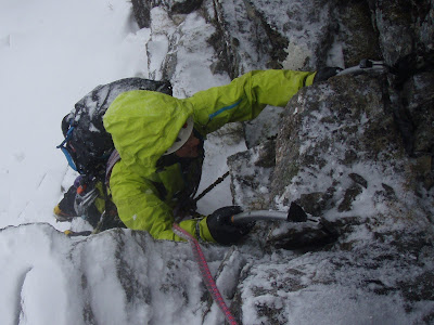 A difficult day for snow conditions. But luckily we spotted a possibility for a safe climb on the SW Ridge on the Douglas Boulder. The only problem would be getting off, West side or East side? The guide book says the route is IV,5** starting from the toe of the buttress - so I gave it a go from the toe.. I got part way up the first pitch and decided it wasn't in condition (that means I got scared!) - so came off (left a nut - so go get it someone..), and went up to bypass the section.. Here is Lena in the photo belayed at the new start ! What was left was III,4.