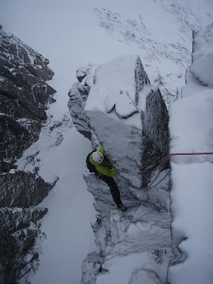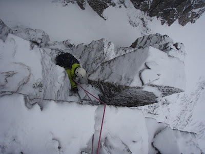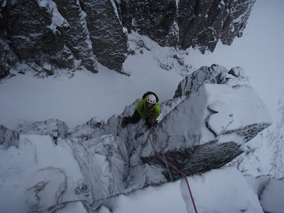 James Thacker did this route on Monday and did this pitch differently, but I led the ropes up the rock groove on the RHS to the cheval move - awkward - awesome..