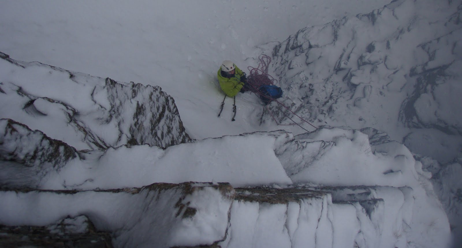 We couldn't go down the East easier gully because the snow was too twitchy. So we ab'ed down the West. Near the bottom, the buttress sloughed off onto the slopes below - so we decided to ab a little more ! Eventually, but safely we got off..