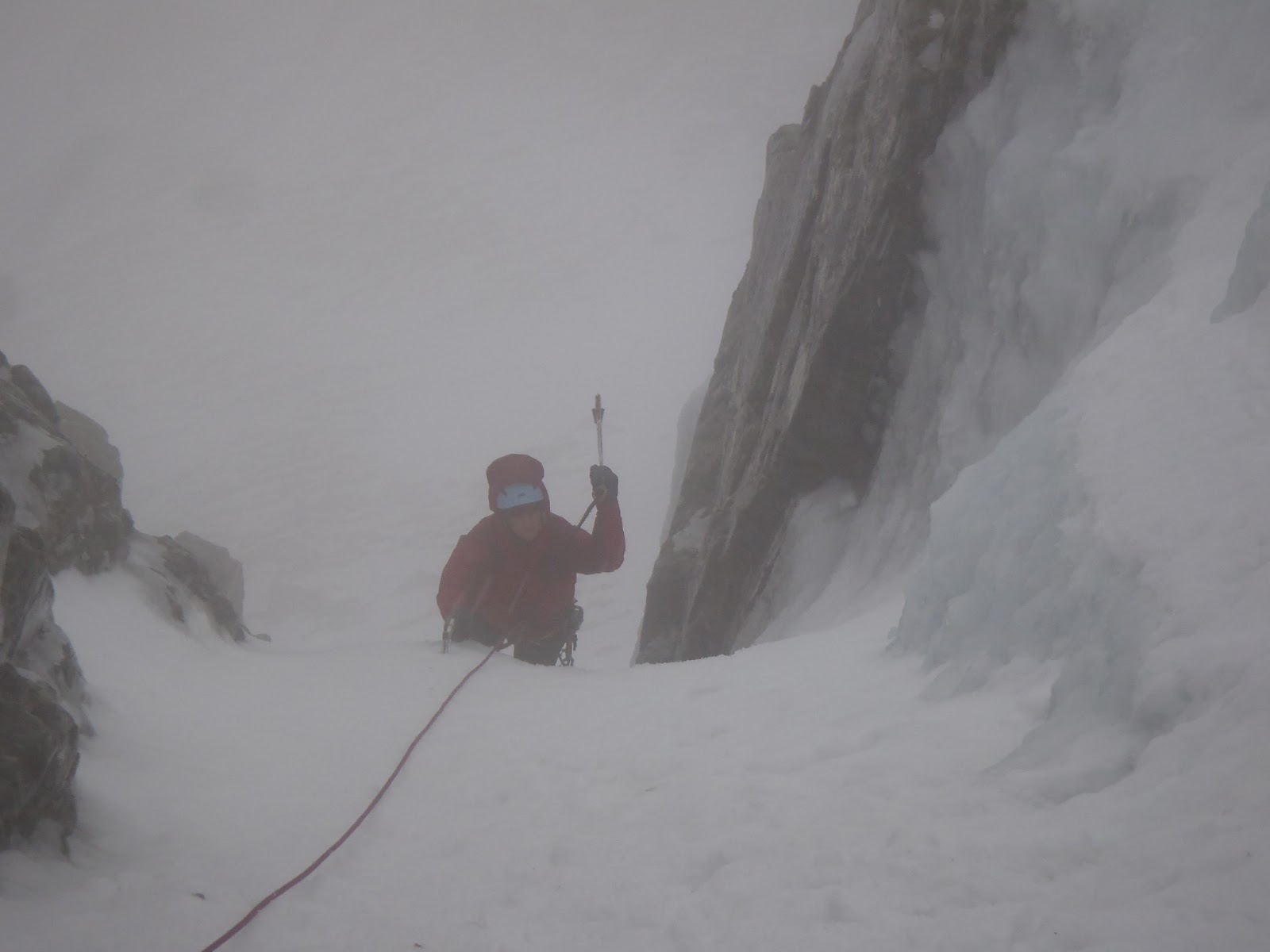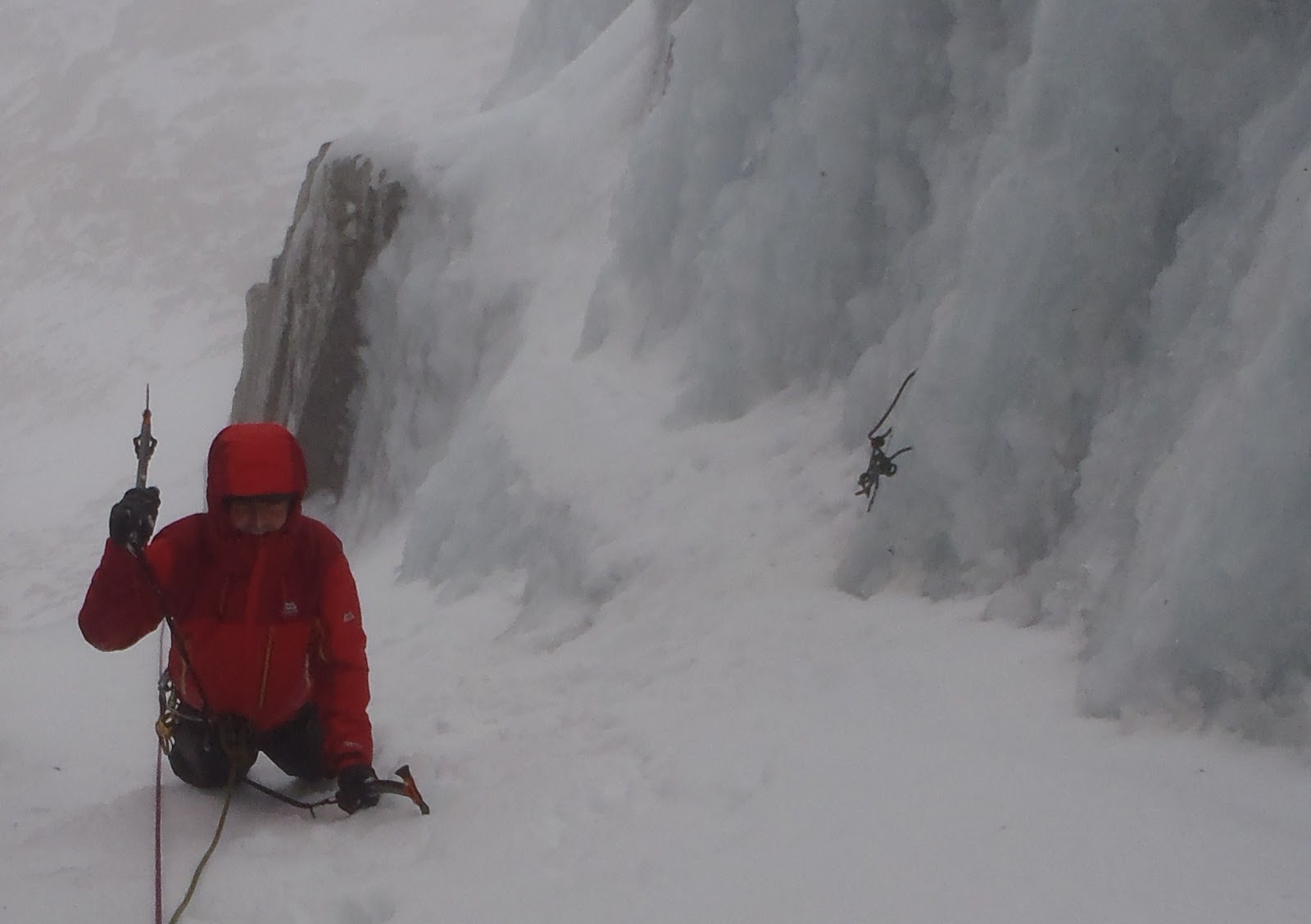 Unsure of the degree of thaw the ice had had, we made our way up to the CIC ice to see what was still possible. It was raining from the beginning of the day to the end of the day, and we found that there was still ice, but it was much reduced, and the crags were generally black and wet. Many of the cascades were still climbable. Andy C took the left main line. Dave H took a good line on the right, and I took a narrow ice line near the left - it's crux collapsed when I got to it, so it turned into a great mixed section. At the top Susie and Adam were having a great time and wanting more, so we headed up to Waterfall Gully which still looked great. The coaching yesterday in the Ice Factor seemed to pay off, because the team got to the belay fresh without pumped arms, and they said that they found it straight forward. I dug out the rock belay high on the RHS, but we later met a team that had earlier used the 2 doubtful ice threads - that were made last week, and much reduced now with a big thaw!