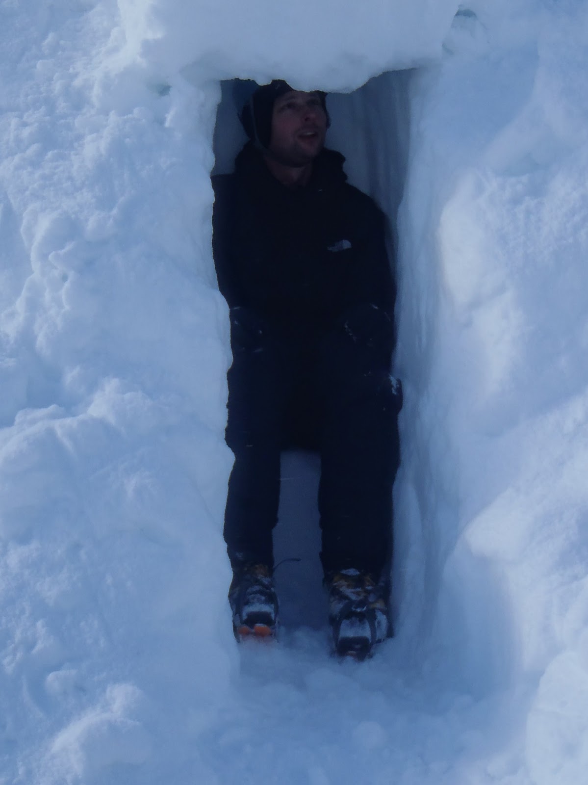 I found the loose block on the RHS (looking down) of the last section of Hidden Chimney. It looks like a good belay spot, but then a simple test of the block shows that it rocks easily, and unnervingly - so it was time to top out instead. Chris and Dave climbed really well, and had a great day. On the way down they were keen to check out the emergency shelters dug out on the morraines. Cheers Dave and Chris for a top weekend.