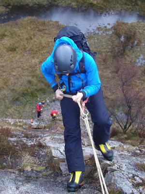 Clive climbing his first of 2 lines up the cliff. After this we headed off to The Ice Factor for a spot of steep ice climbing training. Later Claire learnt how to belay a leader - all that she will need for the next 2 days...