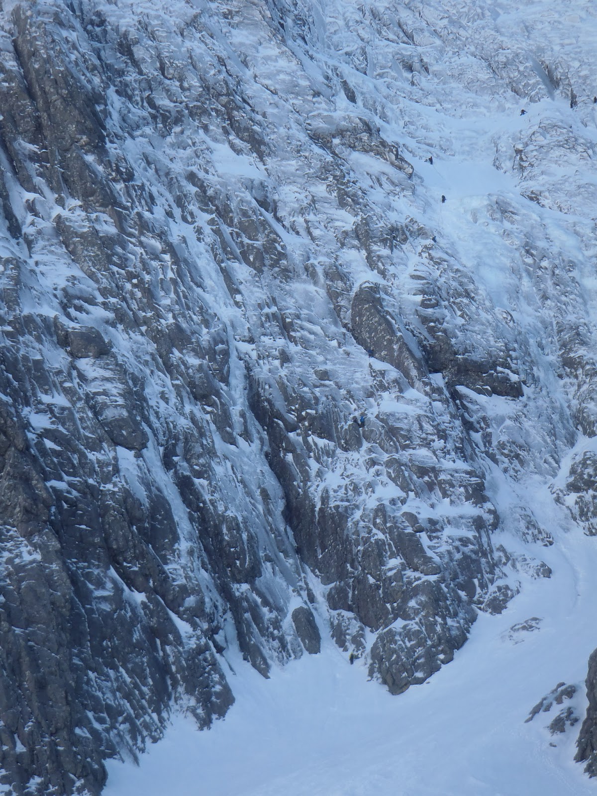 Teams on Minus One Gully (pitch 1) and Astronomy (2 belayed on buttress) |