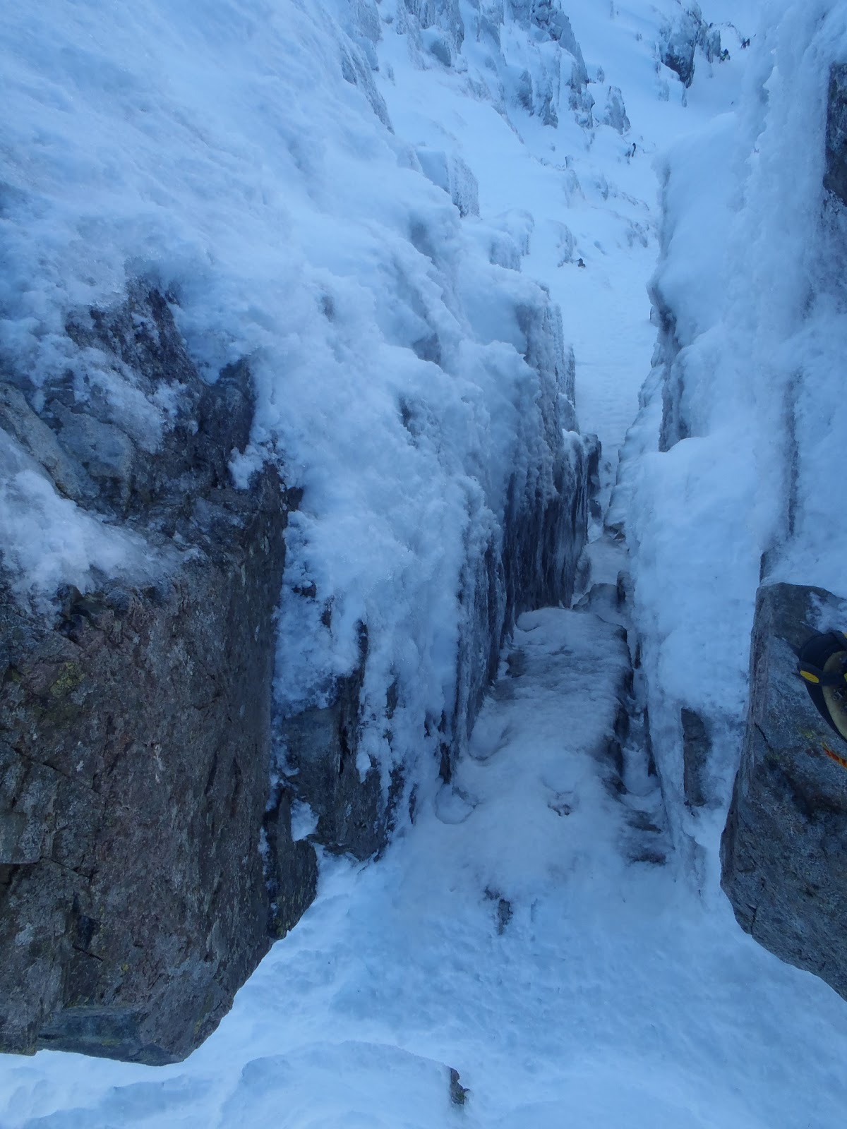I got to the Douglas Boulder Gap and found the Chimney in great condition, and much more icy than I had expected, I was expecting to be hooking on rock, not ice! 10 mins later I passed a couple having fun on the route. They were atop the little tower, which was again climbed using icy hooks rather than rock - and so was the theme for the climb, ice and more ice. I've never found the route to be so iced up, at this point I wondered how the later cruxes would go.