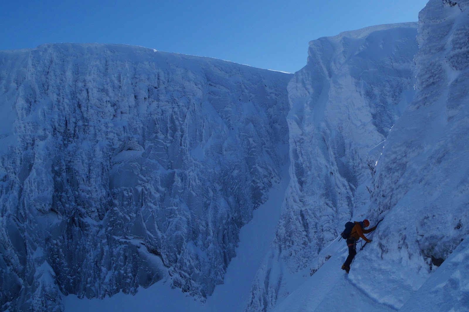 Zac at the start of the Eastern Traverse with Jude. The traverse was stepped, narrow and exciting - brilliant. The tunnel round the corner was full and so I climbed up and over to the final steep pitch to get to the top of the Great Tower. This steep pitch was the crux of my day. The normal rock hooks were iced up, so it was a matter of finding a few good ice hooks you could trust - a few pulls and it was done. I caught up with the French team at the gap. I don't know what they were shouting, but it sounded quite exciting! Once they had passed through, it was my turn. I knew how I was expecting to climb the gap, but the iced rock and verglas in places changed my ideas. The normal rock hooks were chocked with neve, which made them feel even better, then I found the iced corner on the RHS with ice hooks all the way up - so I climbed the gap on the RHS for the first time - brilliant.