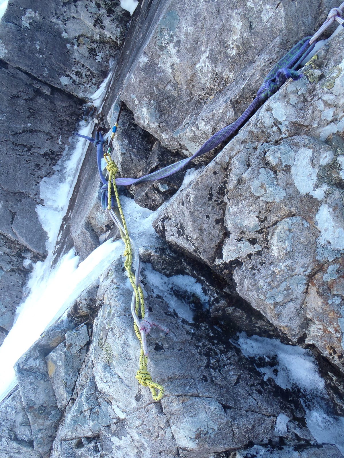 Looking up at the route from the in-situ belay. The slabs look thinly iced |
