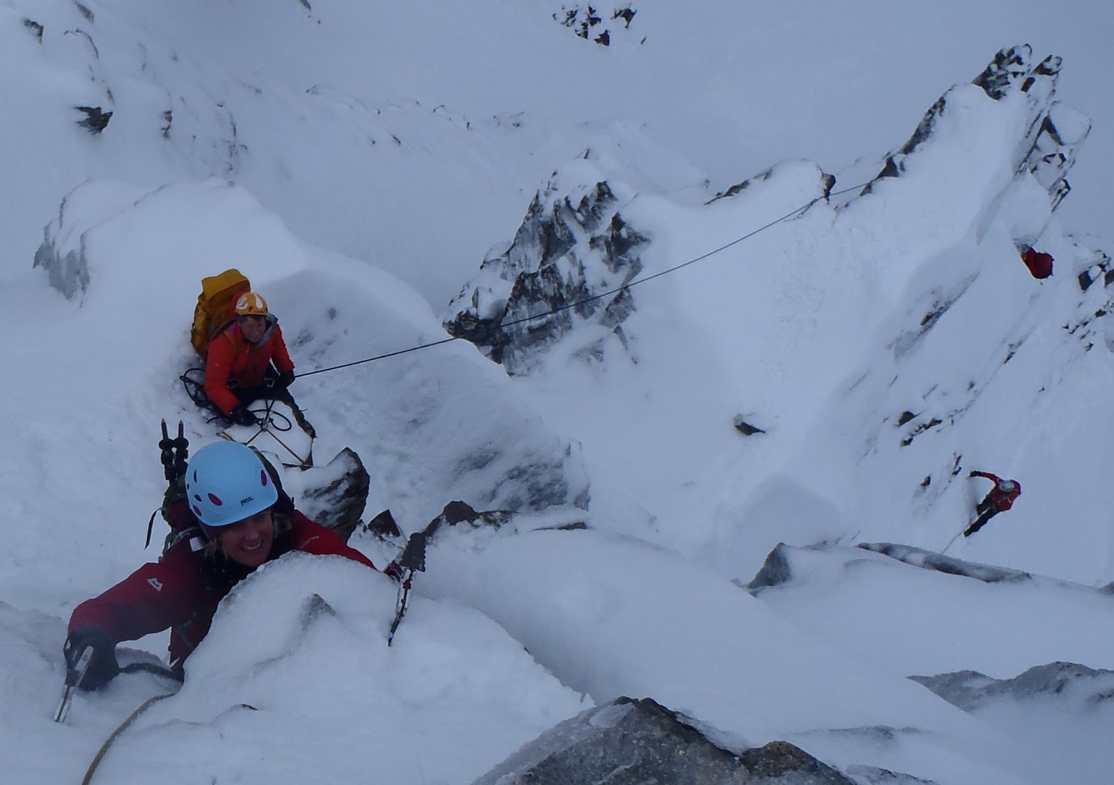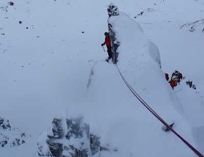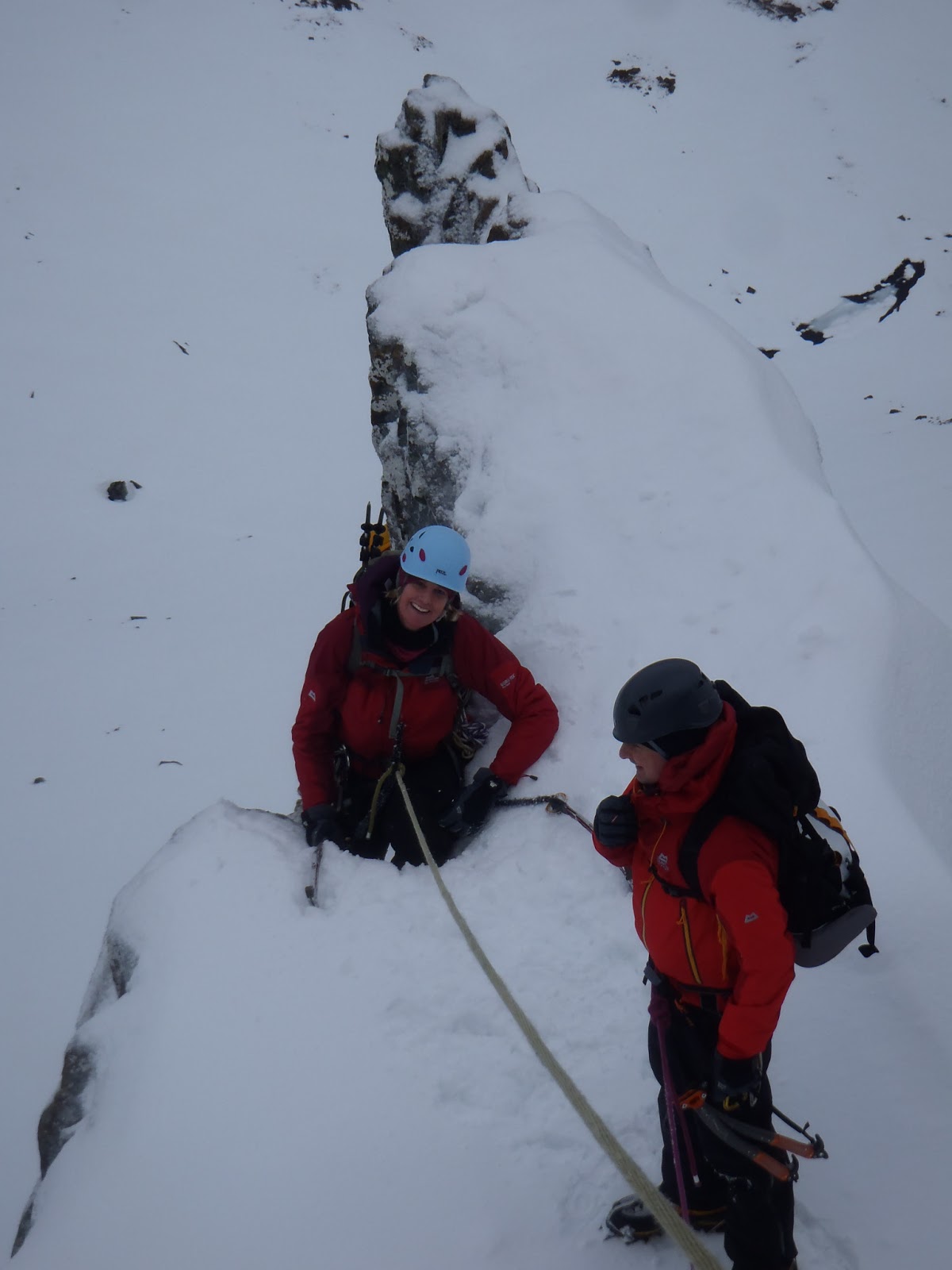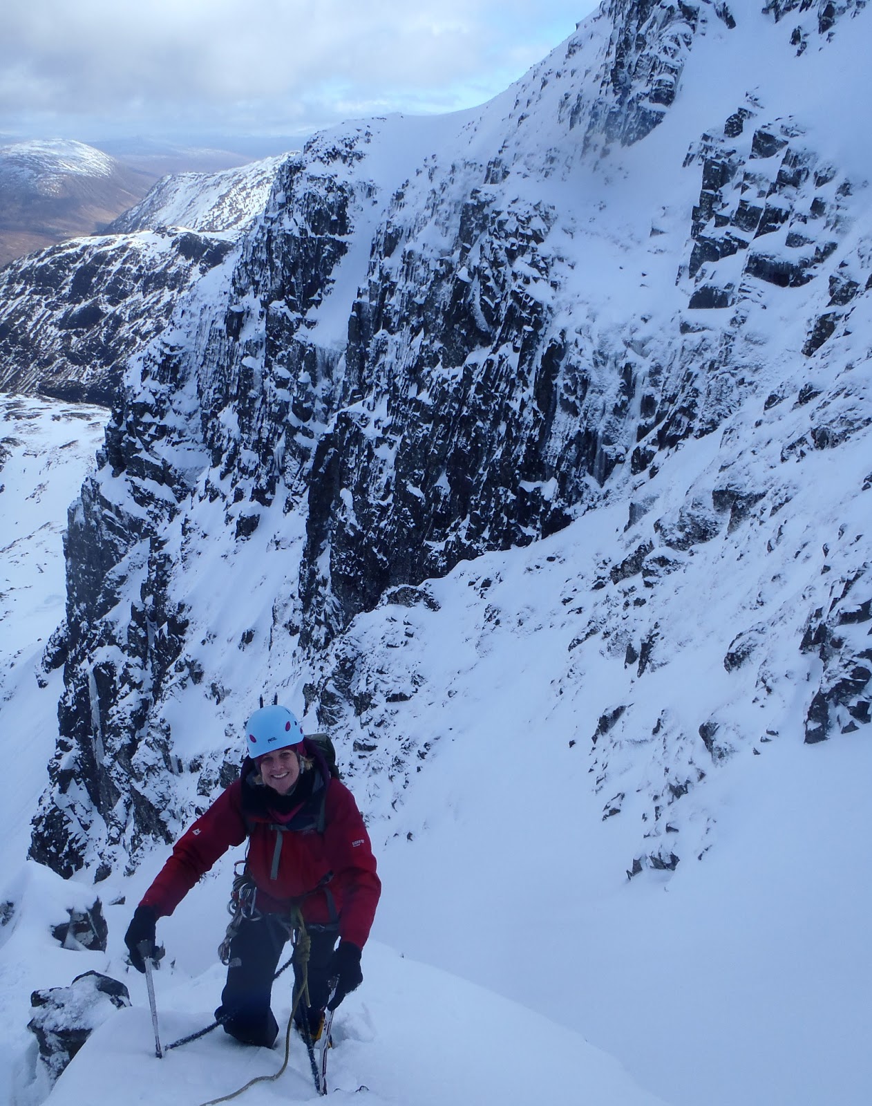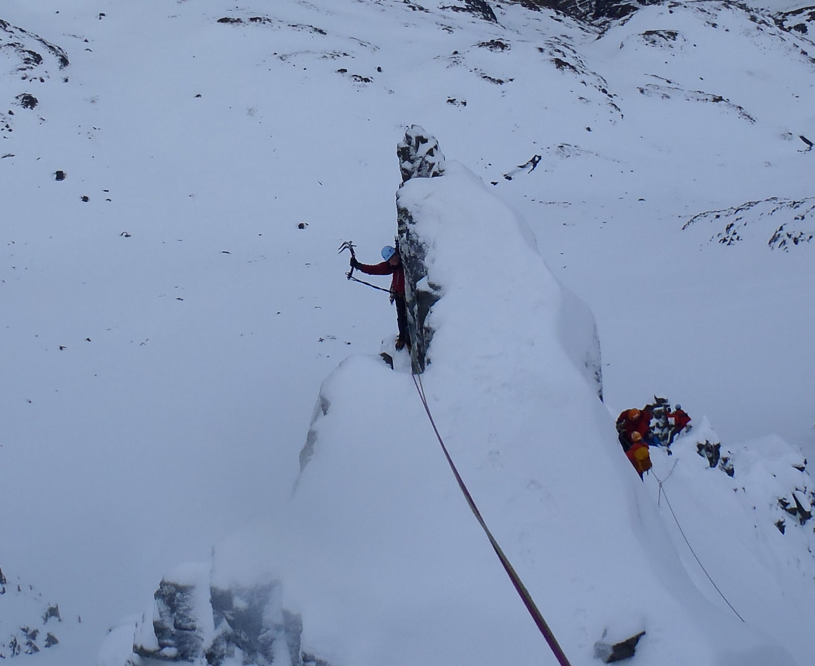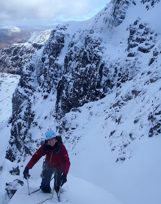 For the last day of the course Adam, Susie and I headed off to Stob Coire nan Lochan to do Dorsal Arete. The day started off with rain (memories of yesterday), and I wondered if I'd have enough gloves for the day, but shortly the rain stopped and by late morning the day had changed and I was just wearing softshell and thin gloves - brilliant. Dorsal Arete was busy, but everybody was sociable and accommodating. Adam and Susie wanted a bit of a challenge and a reason to use their 2 axes so I found the 'back chimney' of the Arete as a good mixed challenge for the team. They helped each other work it out and then moved on to the final mixed buttress to top out. I found some winner hooks to swing on and pull to the top. Adam cleared the ice off the right wall to reveal a tiny front point ledge so he could use a right foot. Everybody topped out happy and buzzing. A great way to finish the week. Thanks for great company, and a laugh all the way.