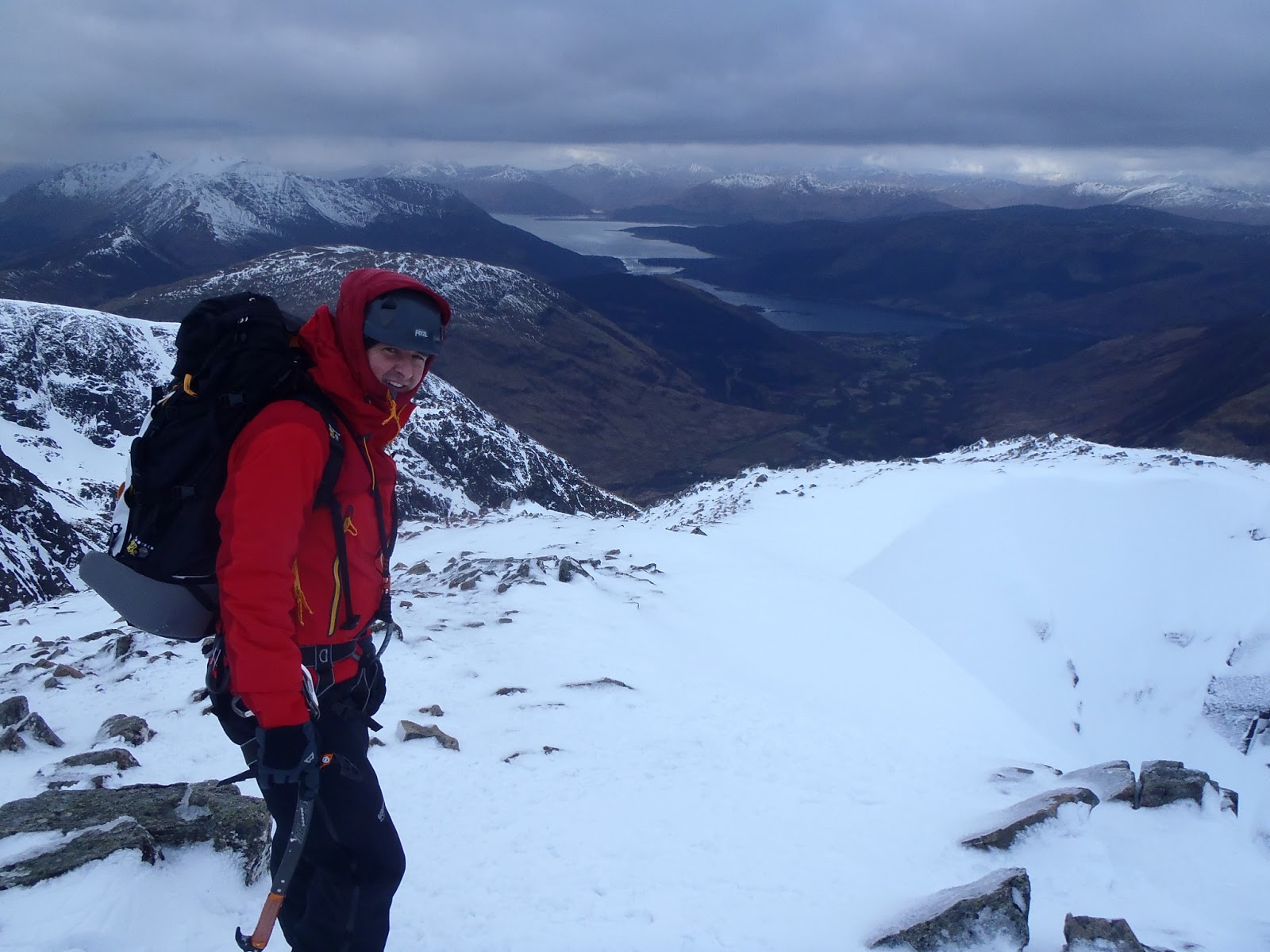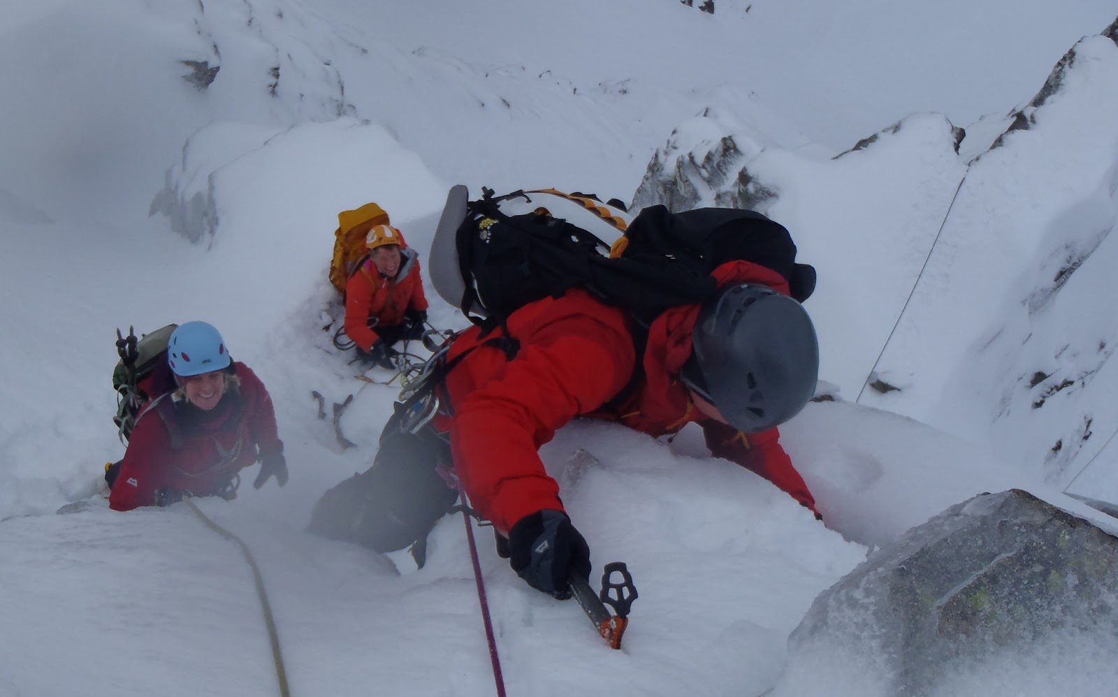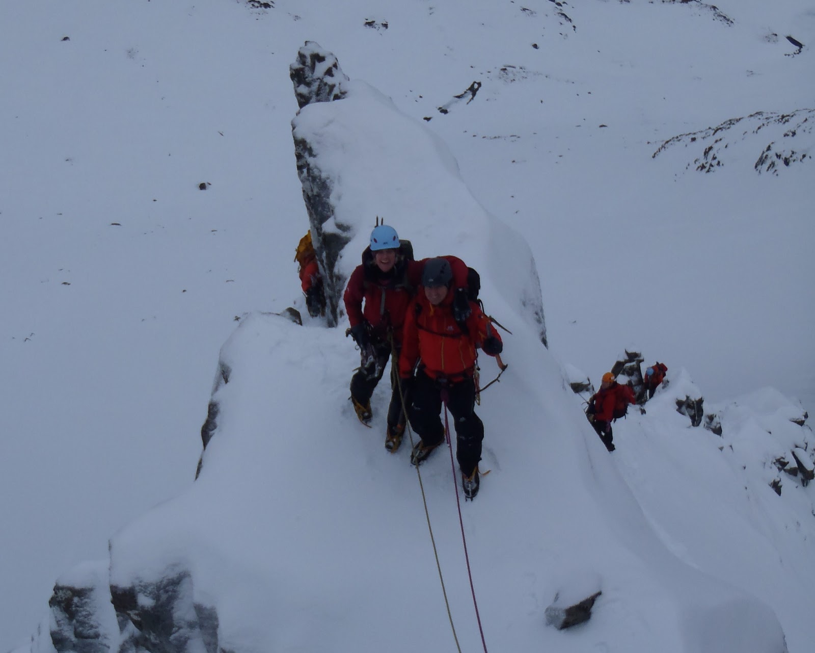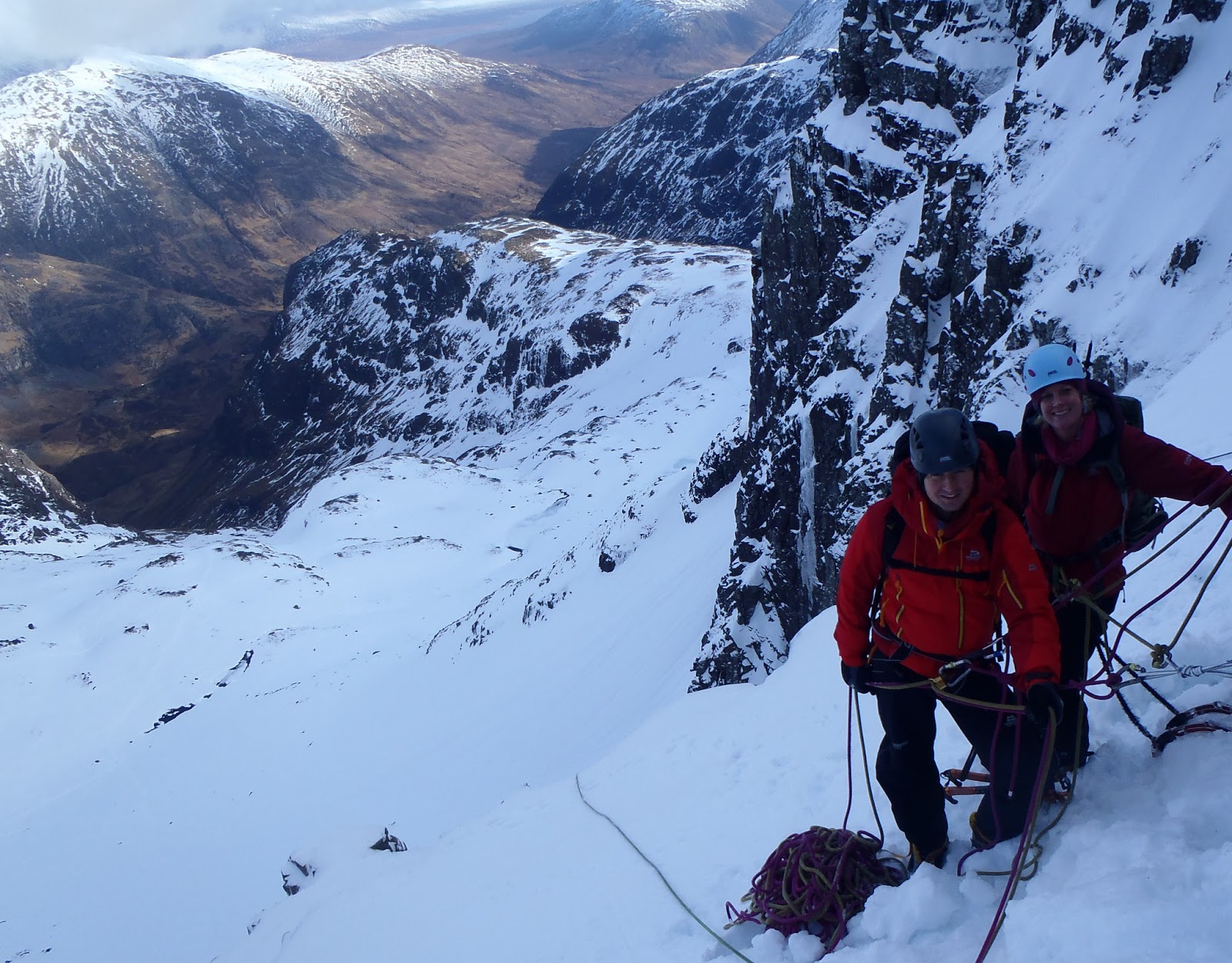 For the last day of the course Adam, Susie and I headed off to Stob Coire nan Lochan to do Dorsal Arete. The day started off with rain (memories of yesterday), and I wondered if I'd have enough gloves for the day, but shortly the rain stopped and by late morning the day had changed and I was just wearing softshell and thin gloves - brilliant. Dorsal Arete was busy, but everybody was sociable and accommodating. Adam and Susie wanted a bit of a challenge and a reason to use their 2 axes so I found the 'back chimney' of the Arete as a good mixed challenge for the team. They helped each other work it out and then moved on to the final mixed buttress to top out. I found some winner hooks to swing on and pull to the top. Adam cleared the ice off the right wall to reveal a tiny front point ledge so he could use a right foot. Everybody topped out happy and buzzing. A great way to finish the week. Thanks for great company, and a laugh all the way.