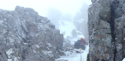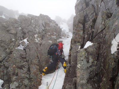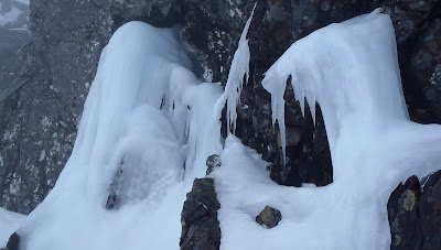 I went to Aonach Mor today with Lena, to see what could be climbed in these thawing conditions. We avoided the crowds of climbers on the East Face today by tactically getting a 10.15am Gondola (aka - starting late!). Everybody seemed to be having fun on Jet Stream over the last few days, so today maybe it would be our turn. We nipped down the Climber's Col and headed for Jet Stream and saw Kenny at the top of pitch 1. Almost perfect timing.