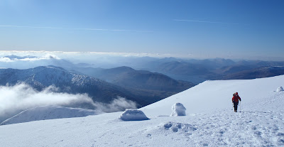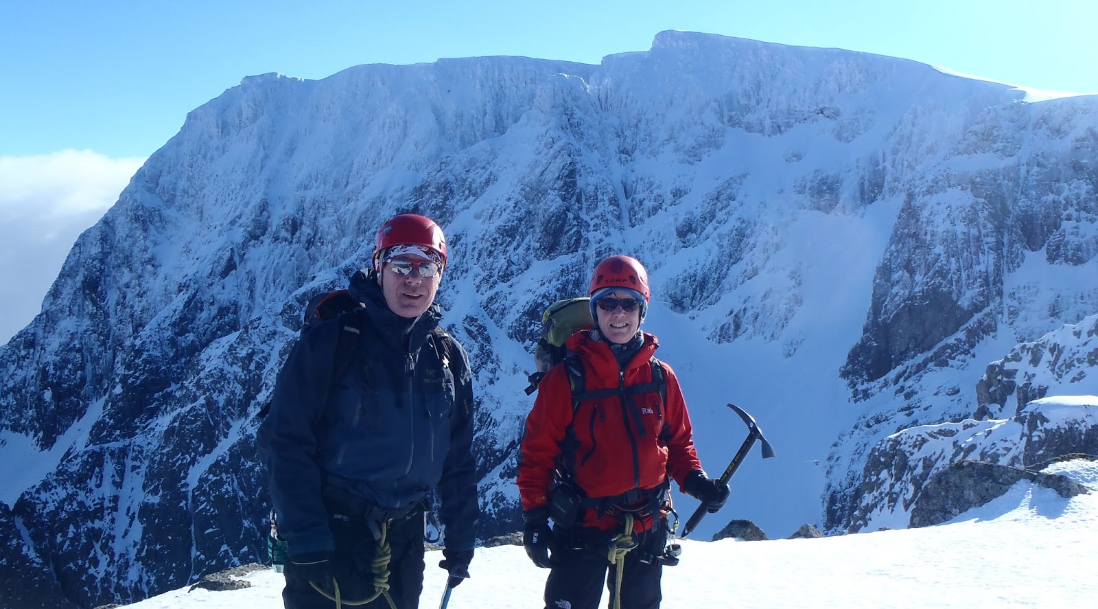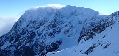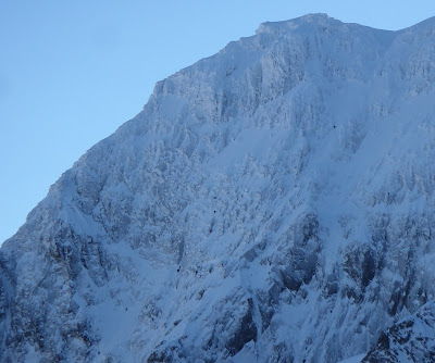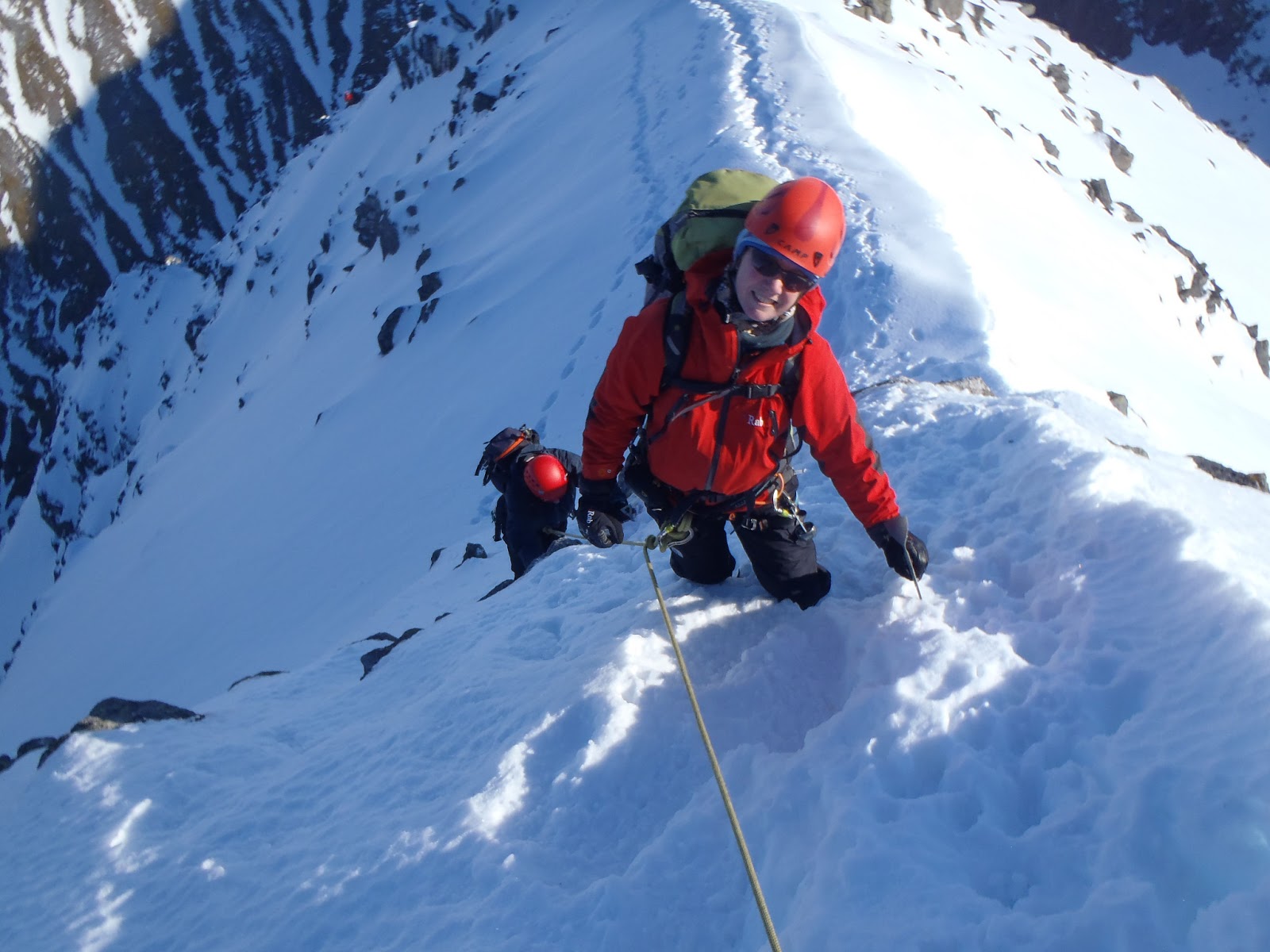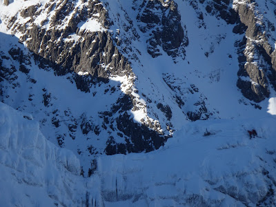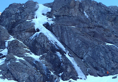 Today I was with Steve and Julia, who wanted a quality mountaineering grade II on Ben Nevis, so that had to be Ledge Route. On our way there we could see that teams had started early for many high mountain routes, especially on Orion Face, all the harder gully lines and Tower Ridge etc. In fact, there seemed to be teams everywhere! The Curtain was still being climbed, although the first few metres look thin.