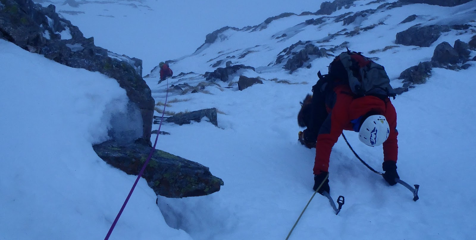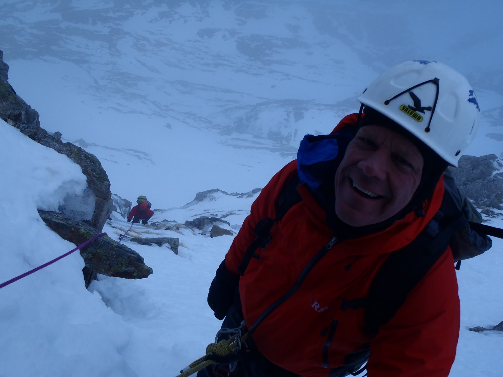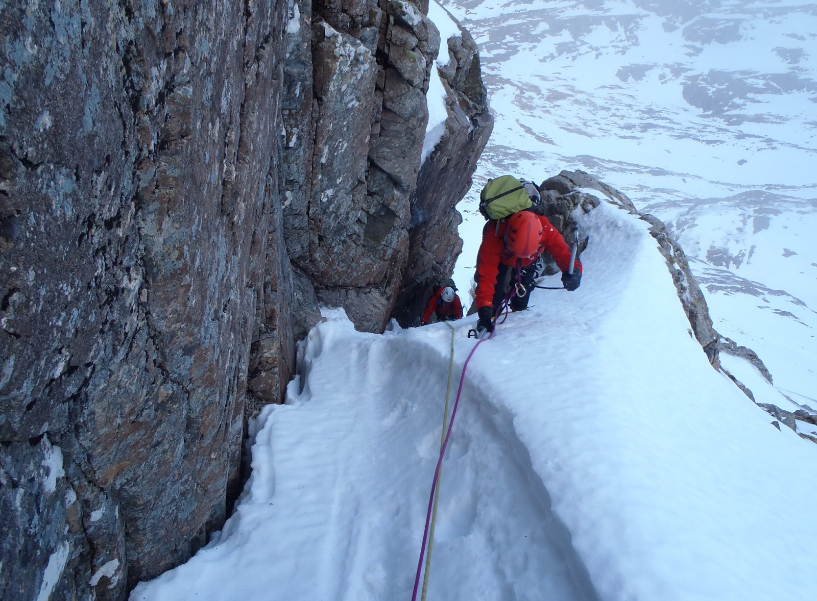 Jagged Globe - Winter Mountaineering CoursePhil, Julia and I headed off to a busy Ben Nevis today. The top car cark was full by 9am and people had set off to do a wide range of objectives, with solid neve everywhere and plenty of ice. A team even climbed the Curtain today (somehow) on a very thin initial pitch, before the overlap. Waterfall Gully, Point Five, North Trident Buttress and Jubilee Climb were also climbed. We went off to Moonlight Gully and found it in good condition. This was the second winter climb for Julia and Phil and they are on a steep learning curve but taking it all in like sponges - brilliant. Later in the day they were even placing their own screws, nuts and friends, and even building their own belays, which we all agreed were strong enough to trust and abseil off. A great day 3.