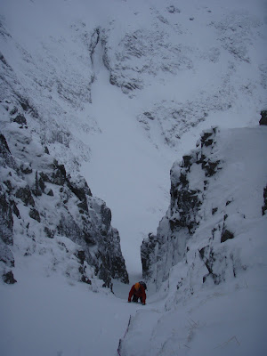 So the plan was to go into the Ben for a look - and possibly do the Douglas Boulder traverse... The wind and snow is forecast to hit later in the day, so we need to be down before mid afternoon - so let's get going.... The route to the base of the West Gully was safe and so the game was on. Here's Ryan at the base of the route.