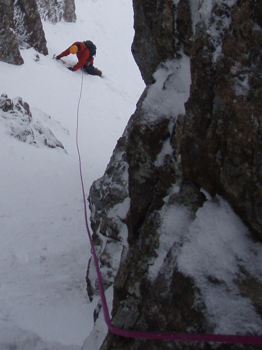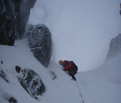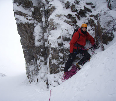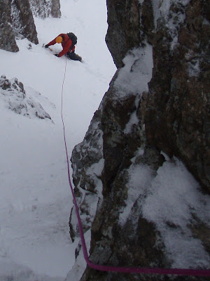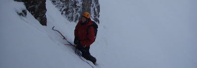 I checked over the top of the gap, and got severely slapped in the face by the 'playful wind! So I sent Ryan up to get the same treatment - awesome... He loved it. This was his first winter lead on day 4. Okay, so the decision was made to back down the same way, using lowers, abseils and down climbing... So here we go, a perfect time to teach Ryan what abseiling is...The wind was really picking up now and it was a clear message to GET OUT..... A good time to get Ryan to do his first buried axe..