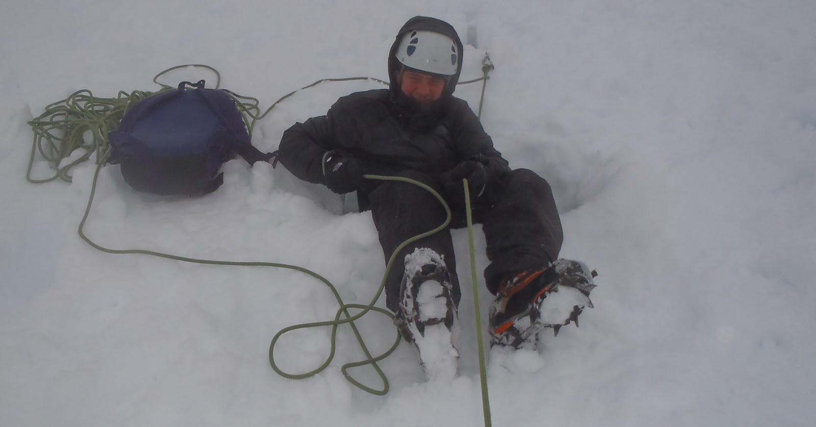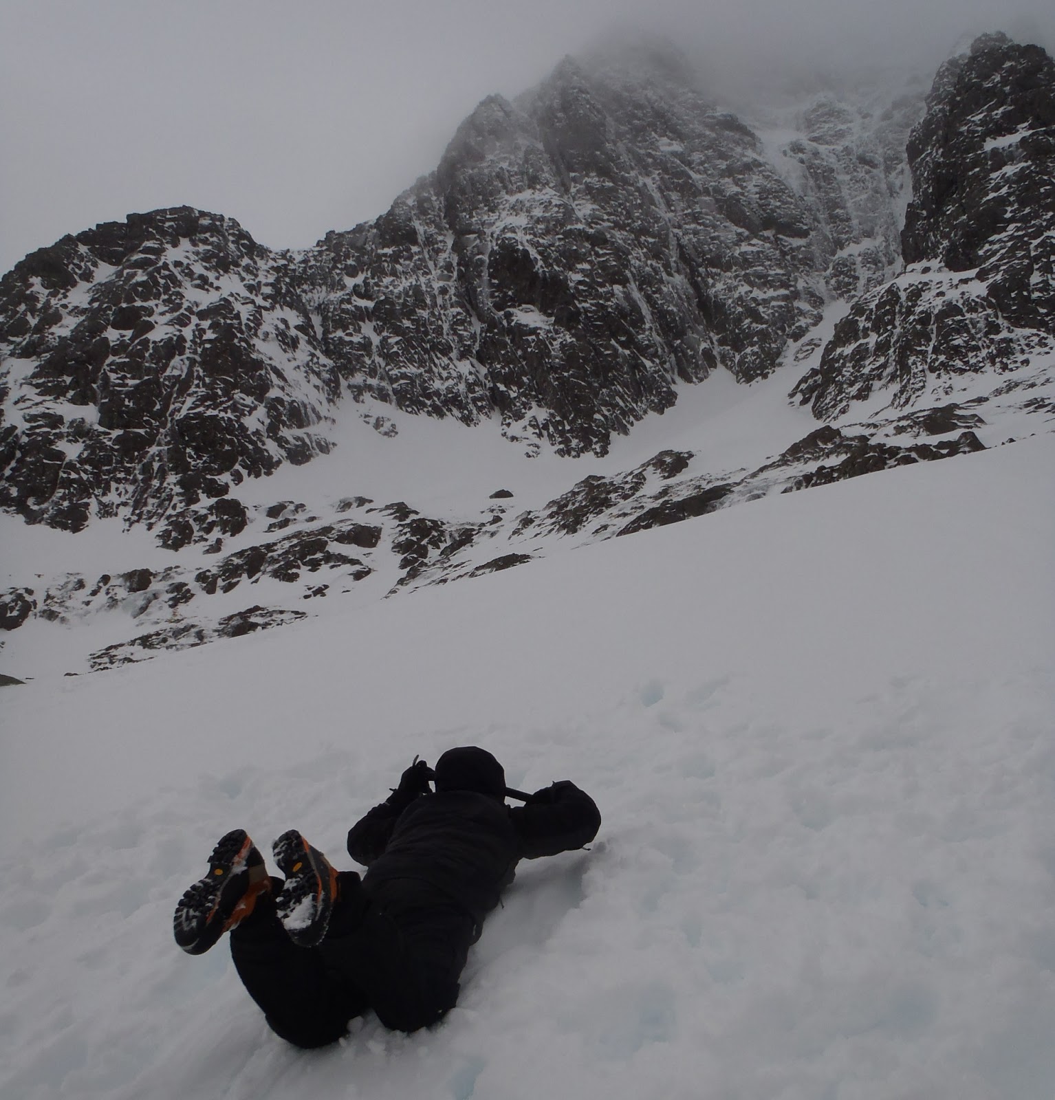 On Guy's second day of his weekend he wanted to learn some of the basics, so we headed up to the Douglas Boulder and Observatory Ridge snow slopes. We had a long session on slipping, sliding, stopping a slip, and stopping a slide before we moved on to the East Ridge up to the Douglas gap. There we went through the nuts and bolts of abseiling. We moved on to Observatory Gully to look at snow anchors and some of the theory of how to stay safe in and around snow.