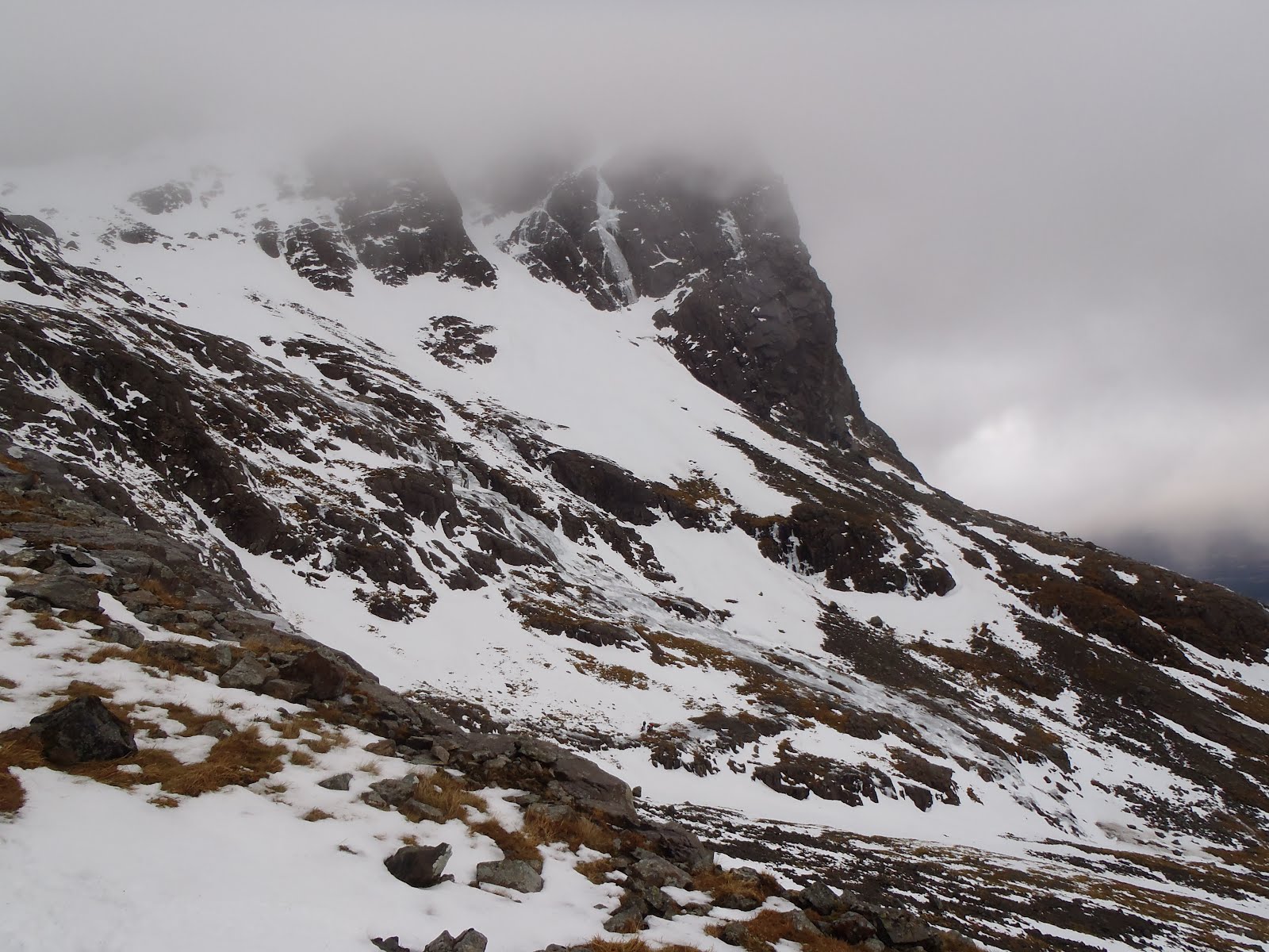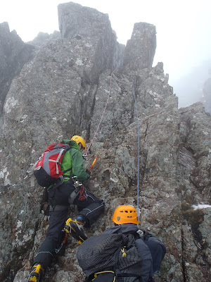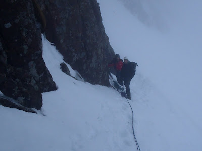 Today on the last day of the Winter Mountaineering course, Nic and Andy wanted a climbing challenge, so we headed to the South-West Ridge of the Douglas Boulder. The climb itself wasn't very wintery! I climbed much of it with gloves and the axes were passengers on the way up - but it was still great fun. It was more than Andy or Nic had tried before, so they relished the new challenge - and I hope it will be one of the memories of their week.