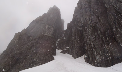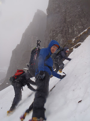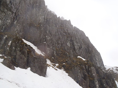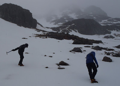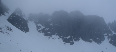 Today the team headed for Stob Coire nan Lochan. The rain wasn't quite so bad today, and the wind was significantly less than yesterday. We got to the Coire and focused on movement skills. We saw the debris from recent avalanches out of some of the gullies.